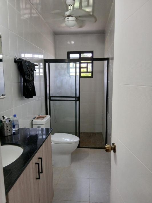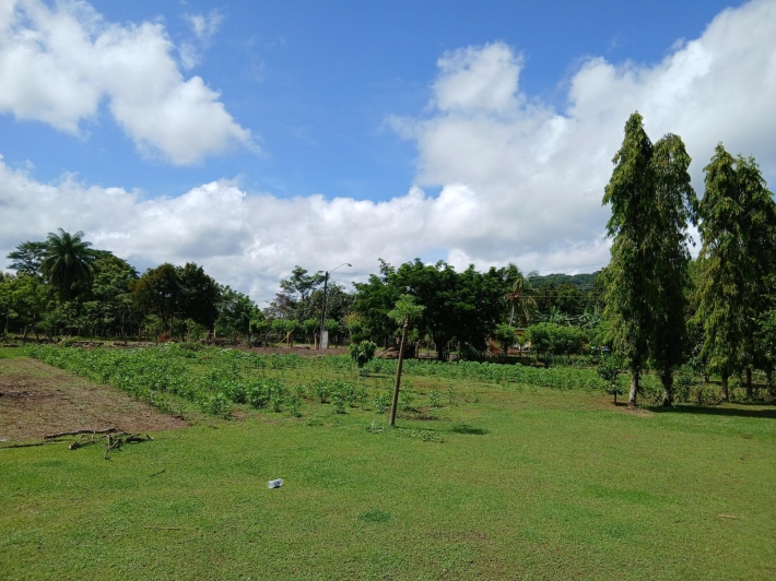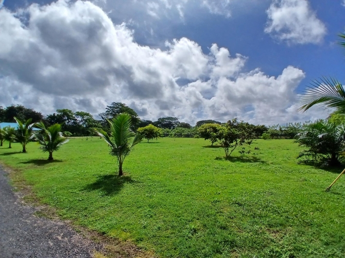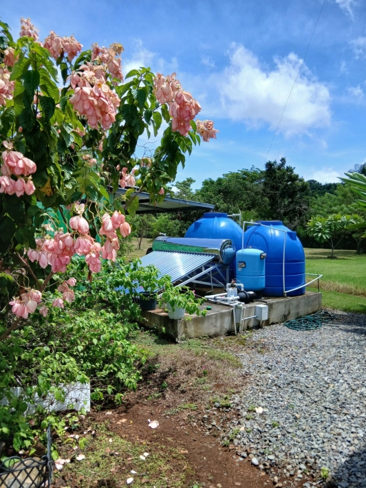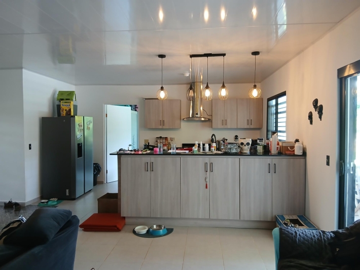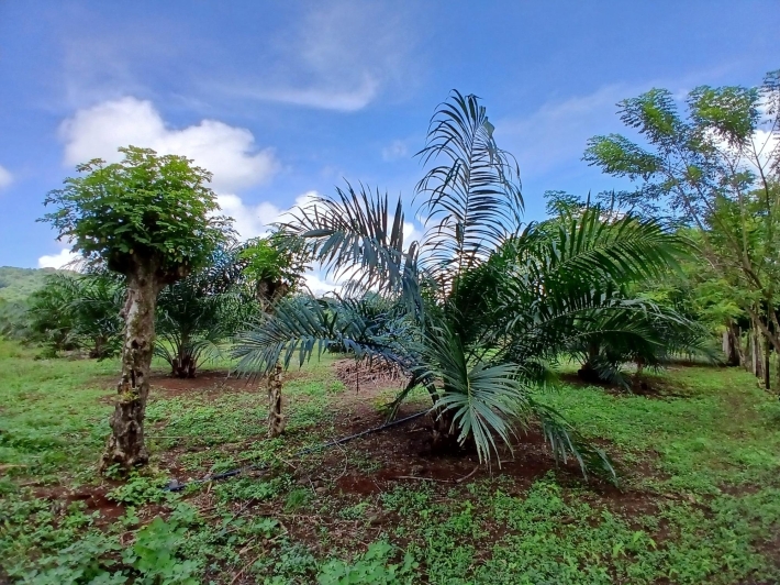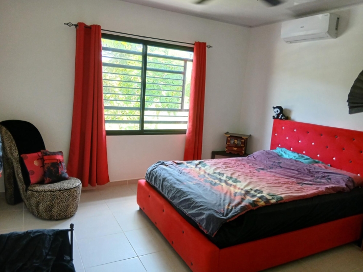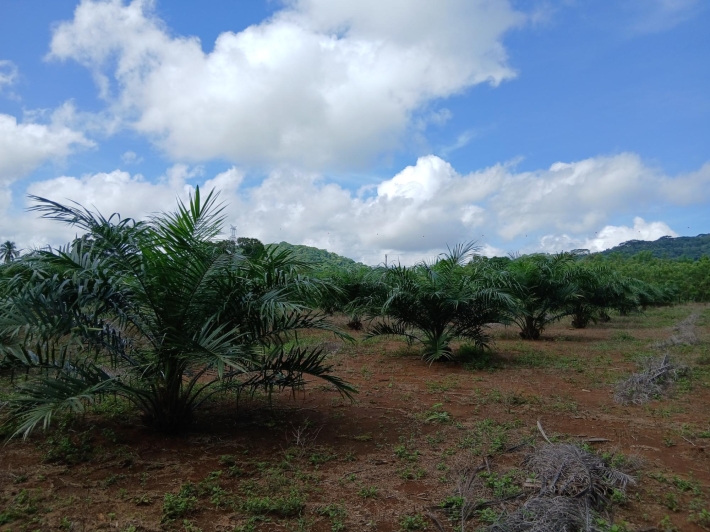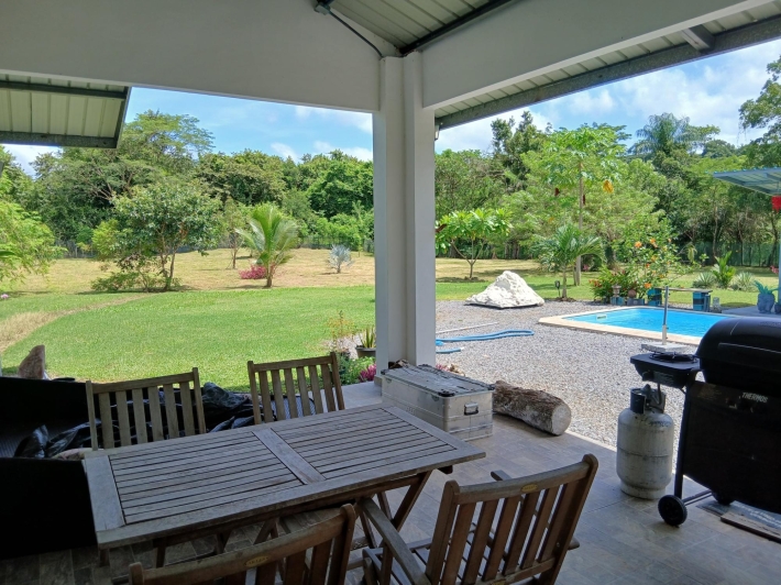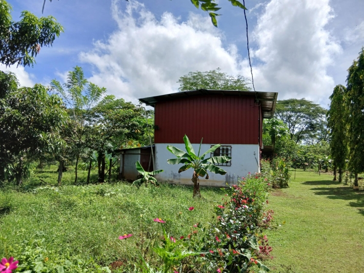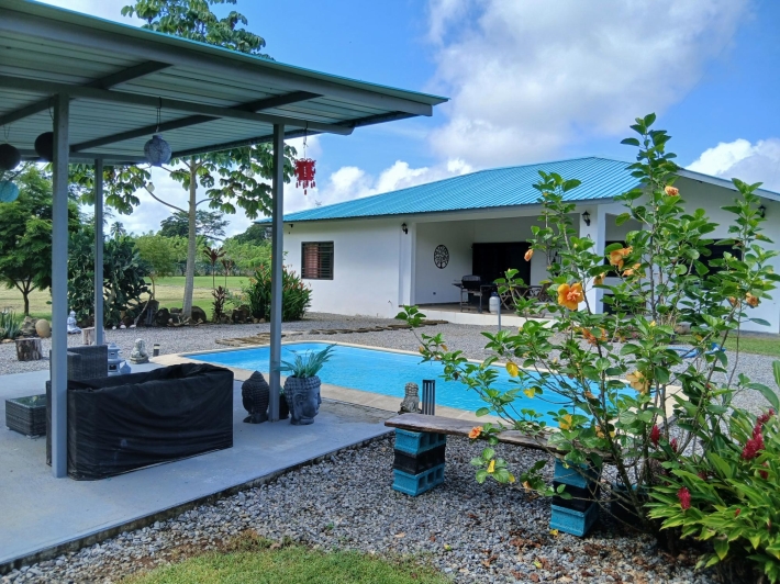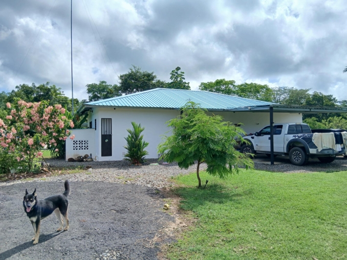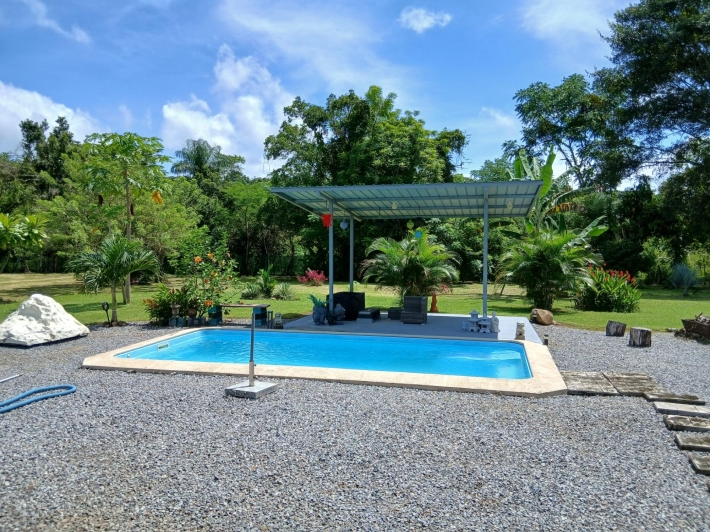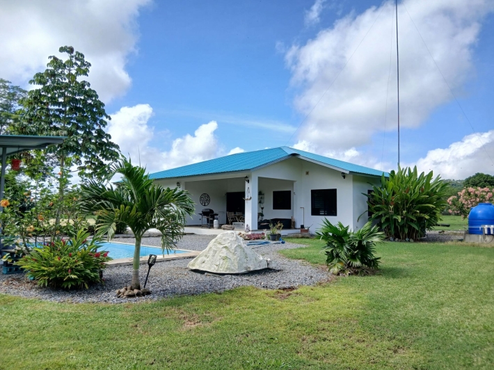 Bring your personal furniture and belongings; everything else is already in place so that you can feel at home right away. The 5-hectare property is divided into three sections, completely fenced in, and located in Zambrano, just a 20-minute drive from David, on a gravel but very well-maintained road. Boquete is a 45-minute drive away. On the 1.5-hectare, very well-maintained part of the property with numerous fruit trees such as papaya, mango, avocado, banana, citrus fruits, etc., you will find the main house, built just 2.5 years ago, with two bedrooms, two bathrooms, a large living room with kitchen, a studio, and a laundry room. There is also a large covered terrace, a pool with another small terrace, and two shipping containers that are used as a workshop and storage space. The house can be operated completely self-sufficiently; there is a solar system, a well, and the hot water is also heated by a solar module. But, just in case, municipal water and electricity are also already installed. The 3-hectare central part of the property is planted with oil palms, which are just coming into production. Another piece of the puzzle for financing your independent lifestyle. The remaining 0.5 hectares contain another simple, older house, which is currently occupied by the employee. There is also a large vegetable garden, a chicken coop, and even space for a cow. All sections are directly accessible from the road, so division would be possible. Need more land? No problem - additional land can be purchased adjacent to this property.