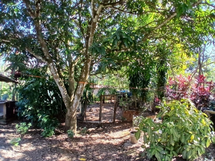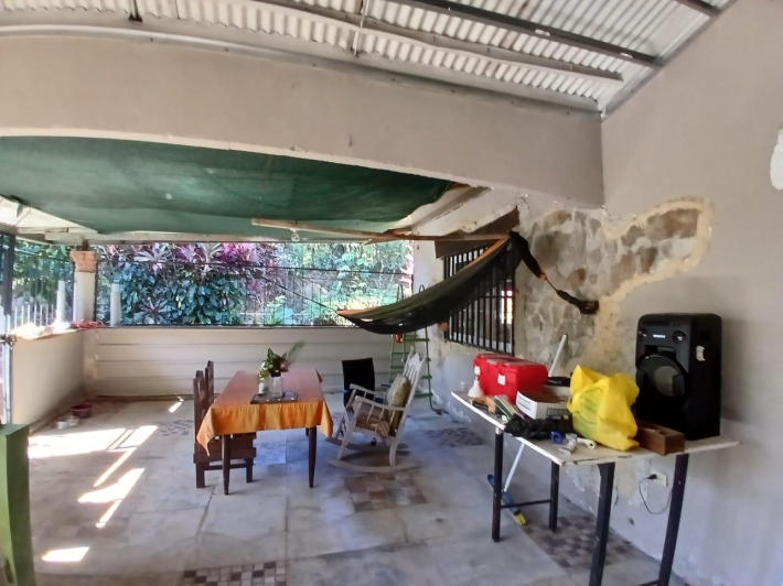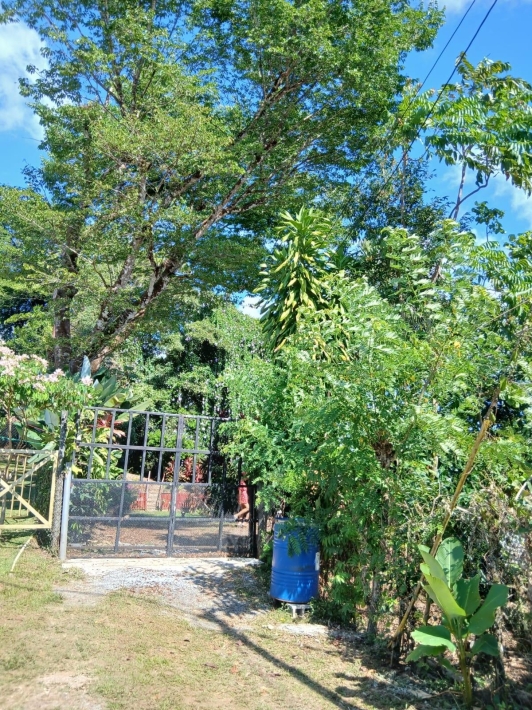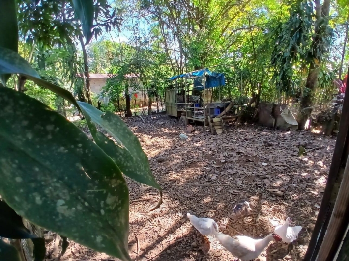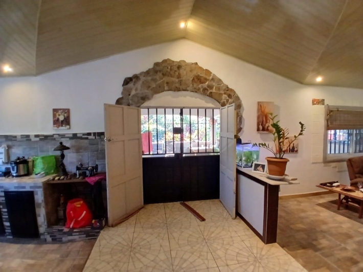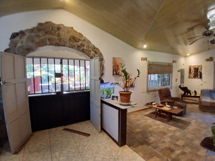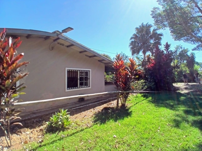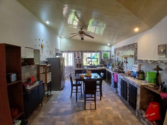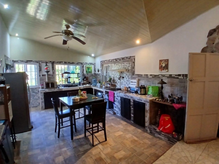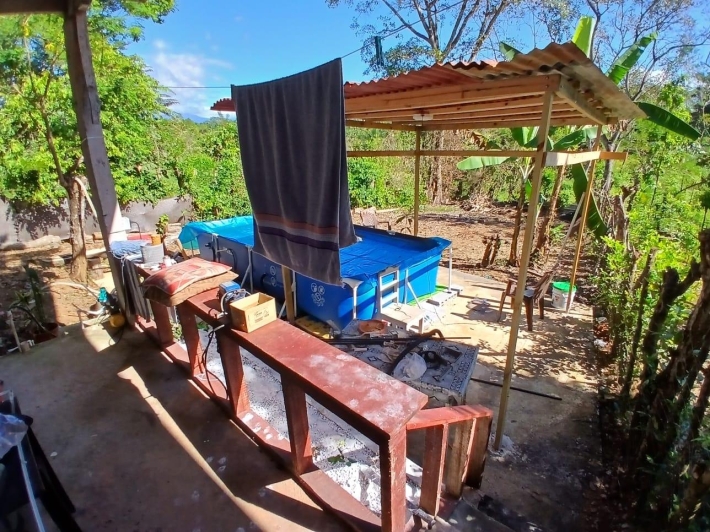 The house, which has been creatively and lovingly renovated over the past two years, has a floor space of 240 m² and features a very large kitchen, dining and living area, two bedrooms, two bathrooms, a large covered terrace with security bars, and a covered parking space for your car. The house comes with all furniture, appliances, and complete inventory—perfect for feeling right at home. The 1360 m² property is located in the second row on the paved road through Tinajas, only a 15-minute drive to David and 30 minutes to Boquete. Nevertheless, as soon as you enter your new home, you feel like you are in a rural setting. Lush plants provide pleasant coolness and tranquility, and a duck coop adds to the country charm. For your security, the lot is equipped with complete fencing, an automatic sliding gate, and solar lamps in the garden. A private well with two tanks, electricity, and internet are also available.