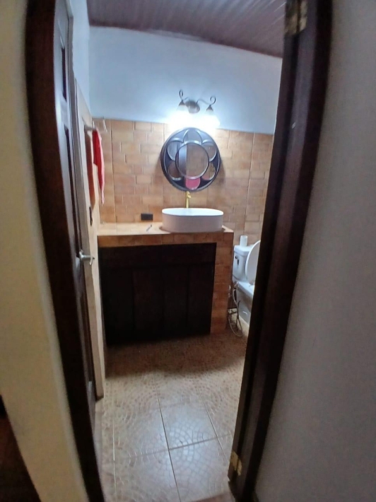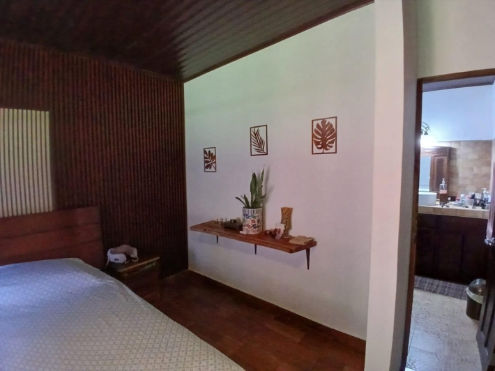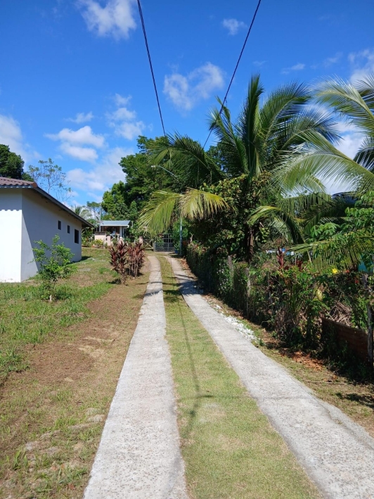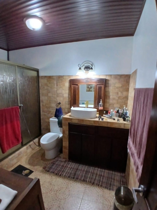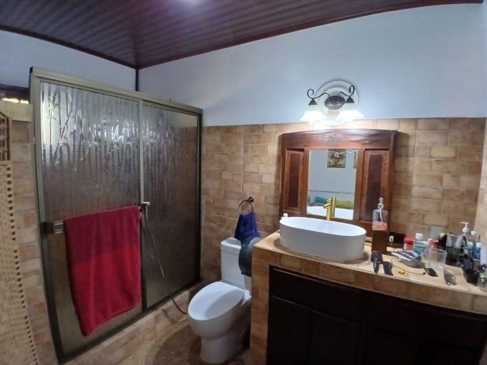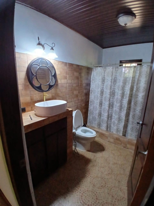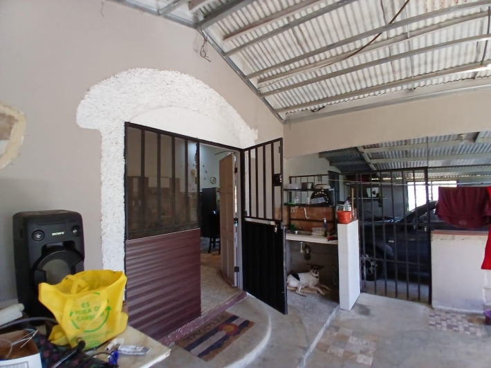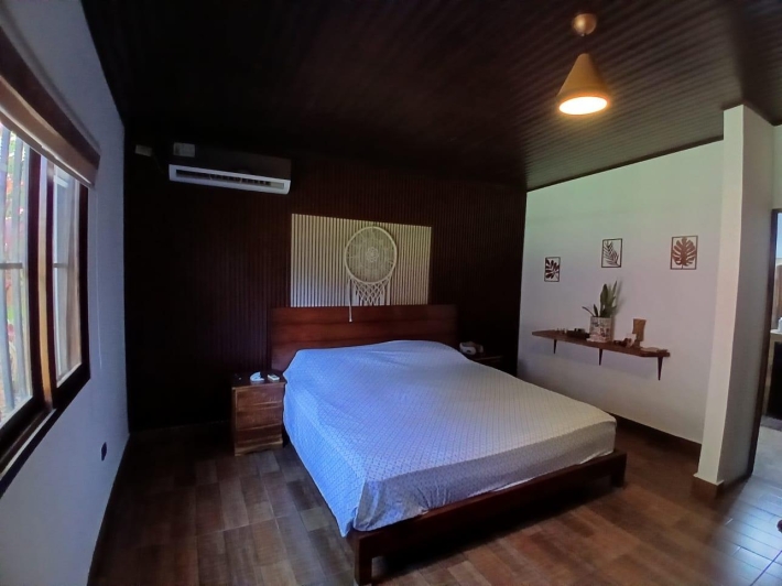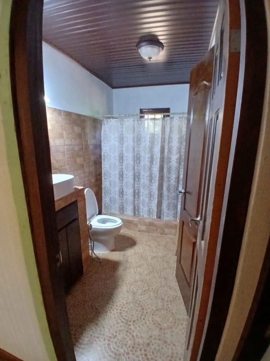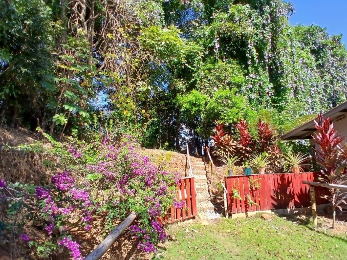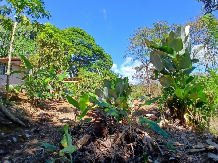 The house, which has been creatively and lovingly renovated over the past two years, has a floor space of 240 m² and features a very large kitchen, dining and living area, two bedrooms, two bathrooms, a large covered terrace with security bars, and a covered parking space for your car. The house comes with all furniture, appliances, and complete inventory—perfect for feeling right at home. The 1360 m² property is located in the second row on the paved road through Tinajas, only a 15-minute drive to David and 30 minutes to Boquete. Nevertheless, as soon as you enter your new home, you feel like you are in a rural setting. Lush plants provide pleasant coolness and tranquility, and a duck coop adds to the country charm. For your security, the lot is equipped with complete fencing, an automatic sliding gate, and solar lamps in the garden. A private well with two tanks, electricity, and internet are also available.