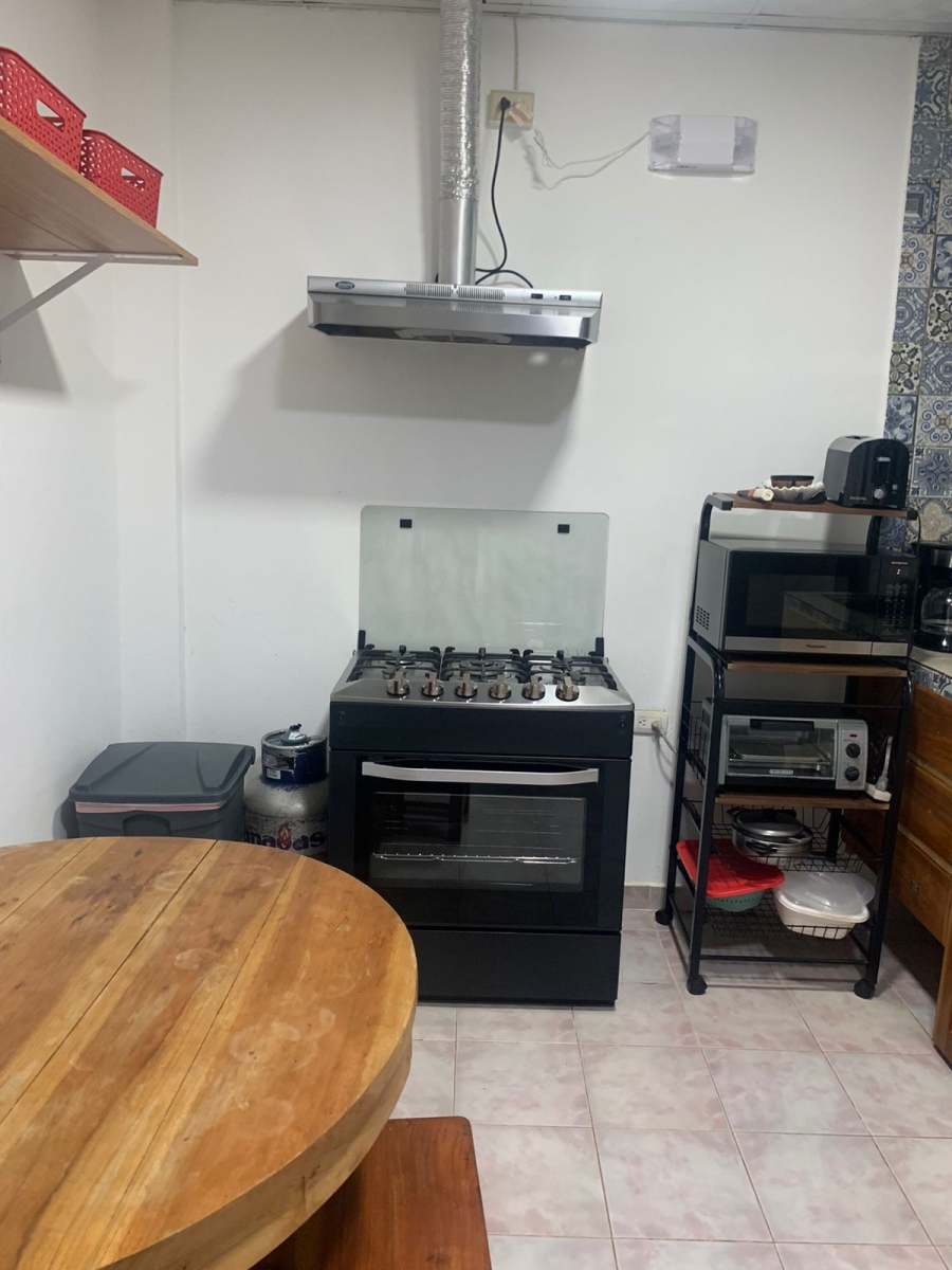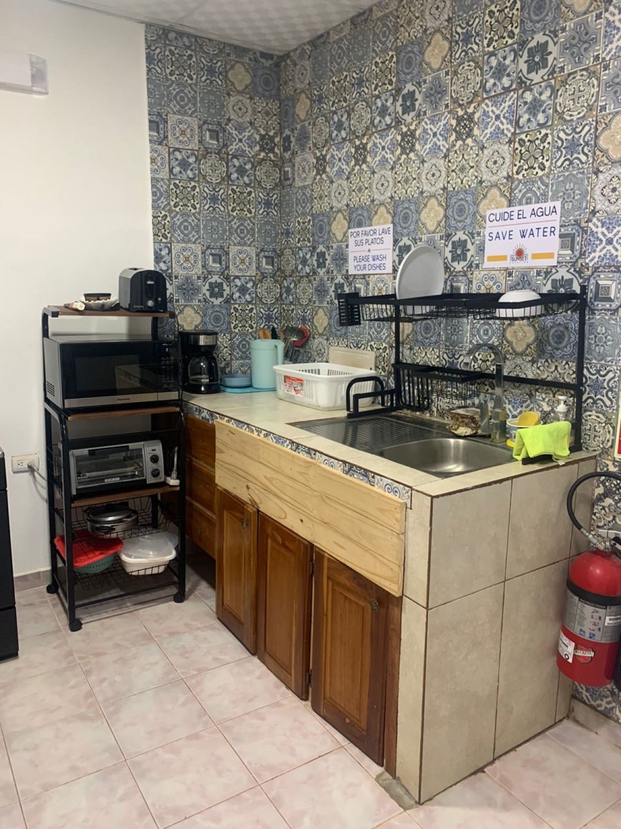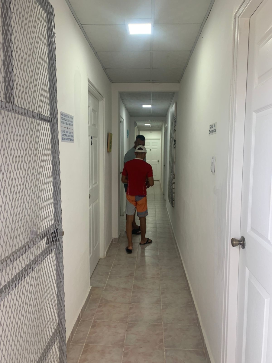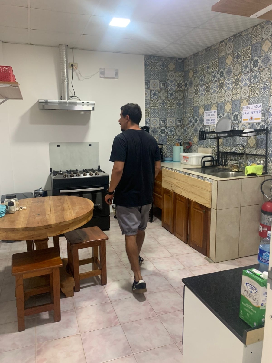 The hotel with 9 rooms on the top floor also includes a reception with small terrace, laundry room, and a communal kitchen with tiled floors and walls, fully equipped with a stainless steel refrigerator installed over a tiled surface, stove with oven, pots, pans, plates, utensils, coffee maker, sink, table and chairs.