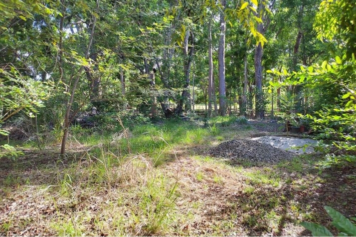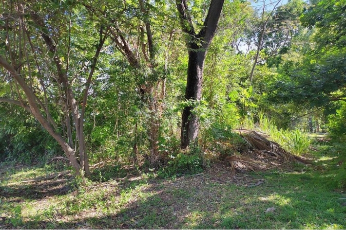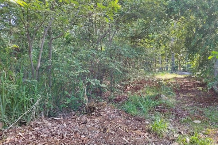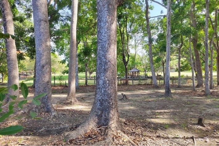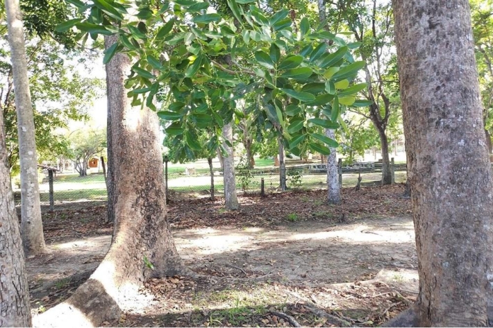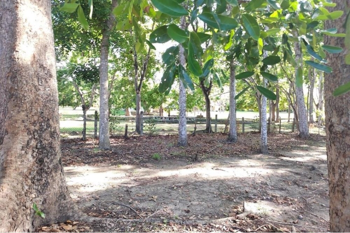 Beautiful and wide view towards a farm with trees, gardens and lake in the back.