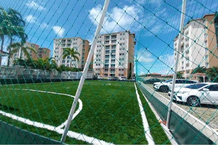 In the social area, you will find an adult and children's pool, a playground, a mini soccer field, and a BBQ area. The building is part of a gated community with a guard and security.