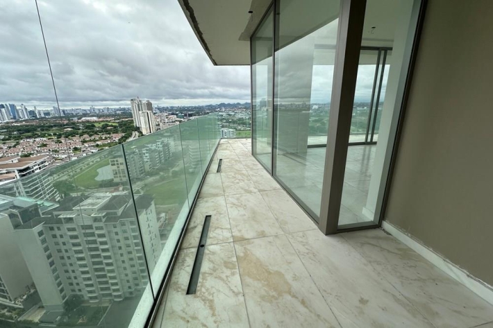 Balconies and terraces are designed with safety glass railings and gold profiles, providing a touch of sophistication