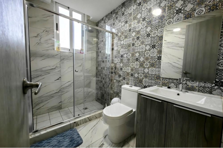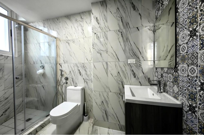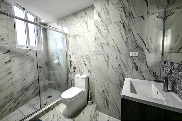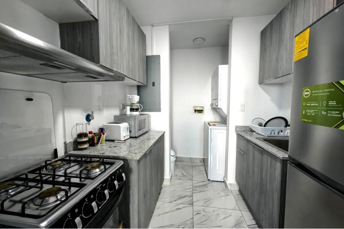 This bright apartment features a living-dining room, one bedroom with a private bathroom, a second full bathroom at the apartment entrance, a kitchen equipped with a laundry area, large windows with cross ventilation that allow natural light to enter, and a spacious balcony offering beautiful views of the sea and the bay.