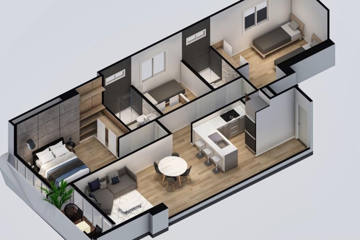 The apartments have a large living/dining room and balcony, a kitchen equipped with upper and lower cabinets, a laundry area, 2 or 3 bedrooms with large windows (depending on the model) and a storage closet.