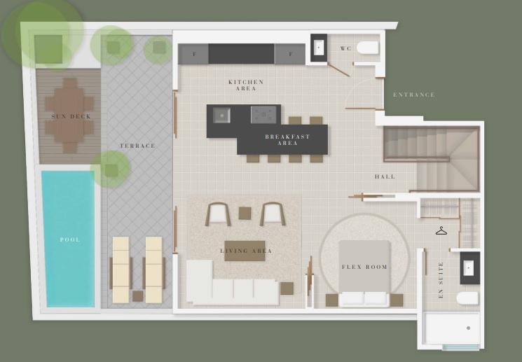 o Layout: Duplex with 2 bedrooms, 3 bathrooms, private lounge, terrace with pool, and sun deck.