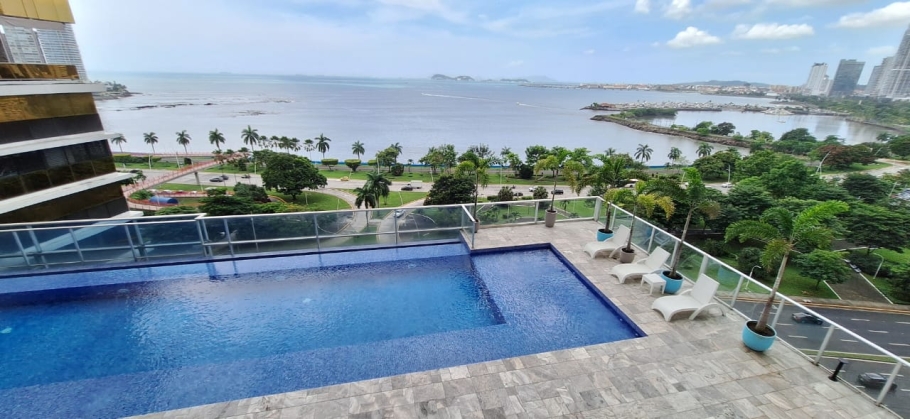 Lobby with 24/7 security, elevators, pool with panoramic views, fully equipped gym, children's playground, multipurpose court, and sauna.