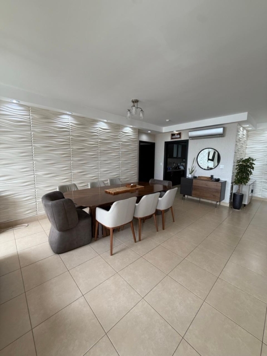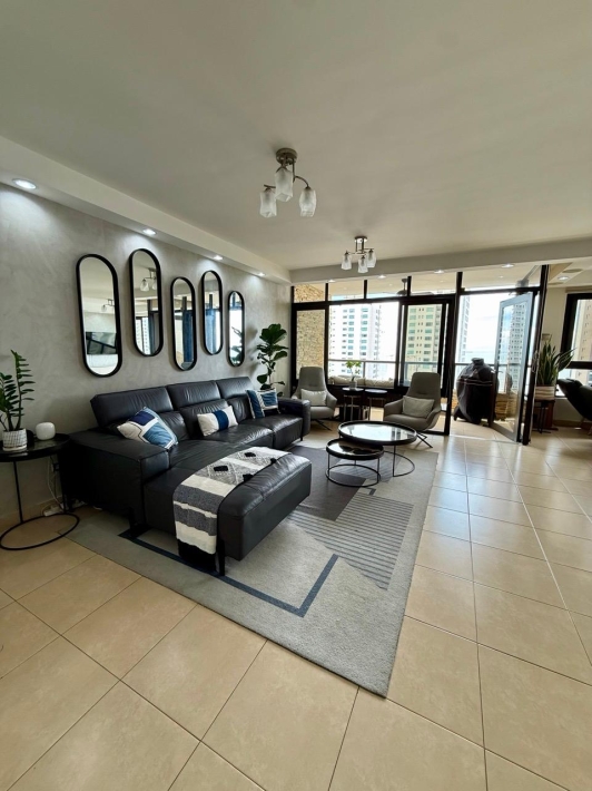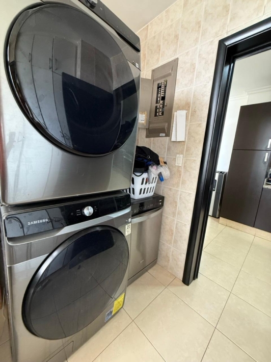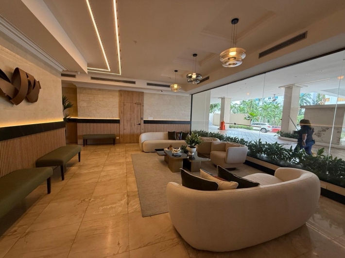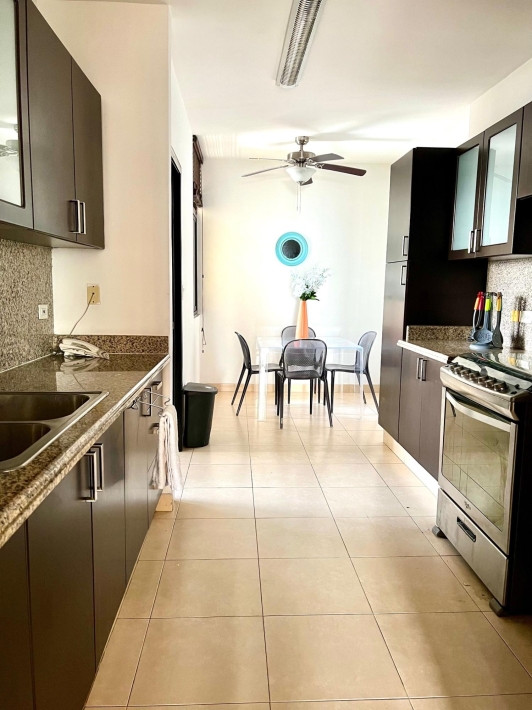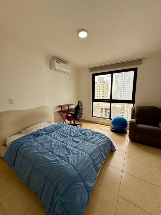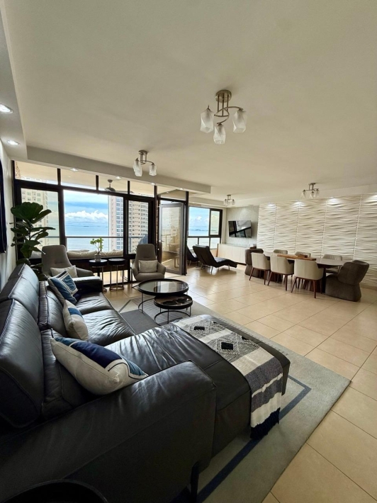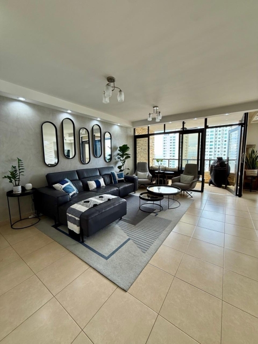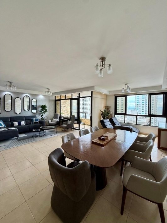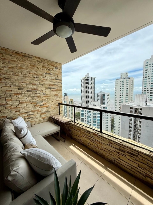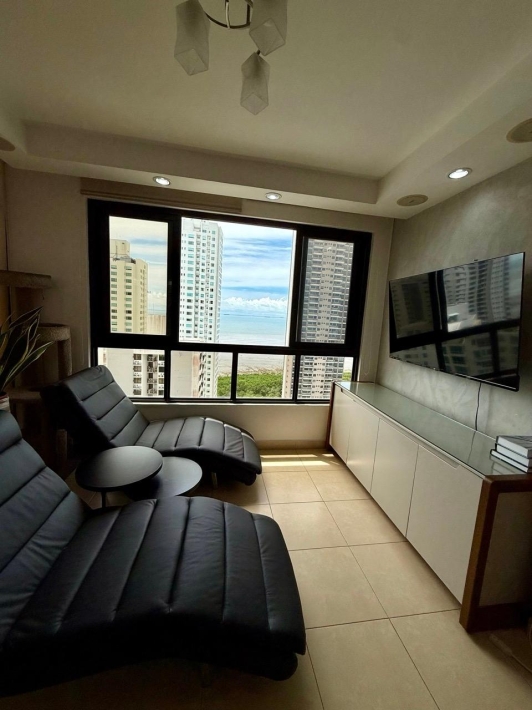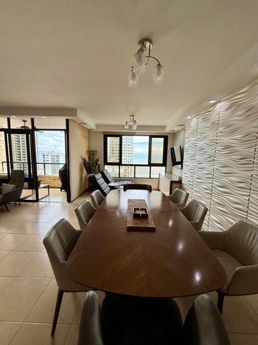 Fully furnished apartment for rent in Parque del Mar, with ocean views, high floor, with large balcony, living and dining room, a family den, 3 bedrooms with bathrooms, a kitchen with a laundry room and a maid's room, air conditioning and appliances, 2 parking spaces. It has an excellent location, close to multinationals, shops, restaurants, banks, schools, recreational area, and more.