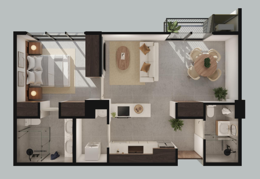 Model D: From 59.10 m² · 1 bedroom · 2 full bathrooms · laundry · balcony or terrace