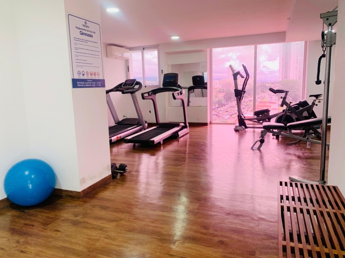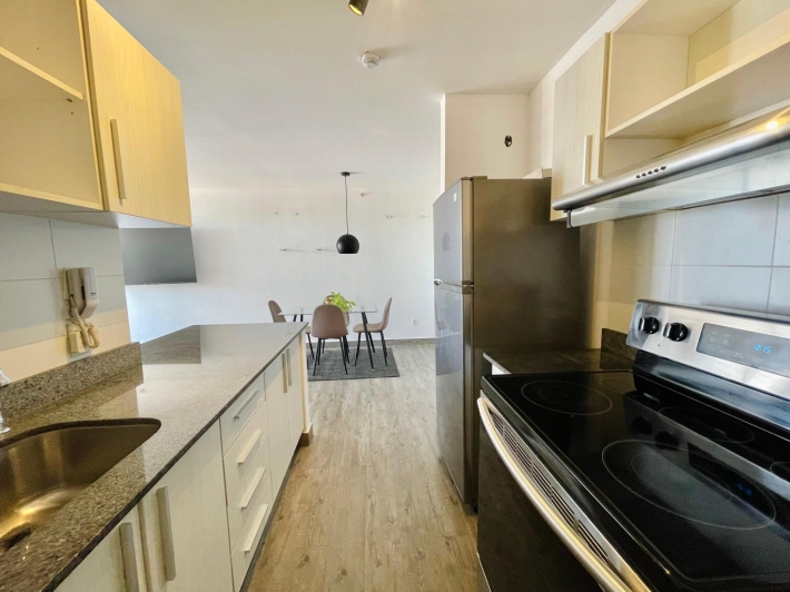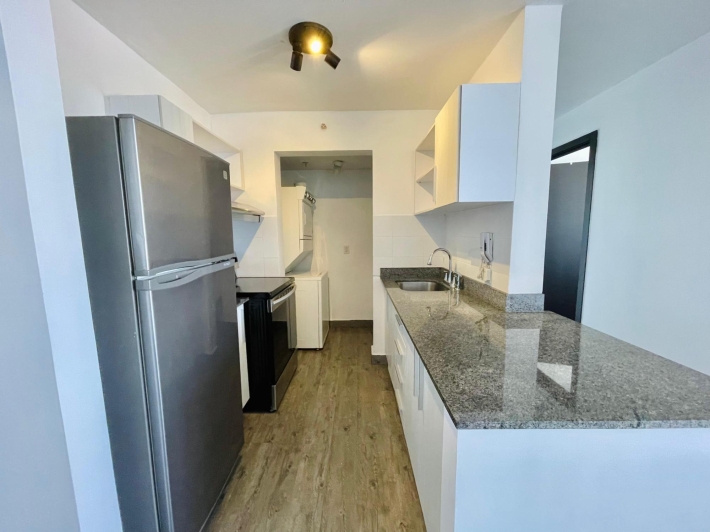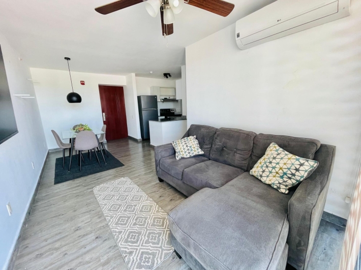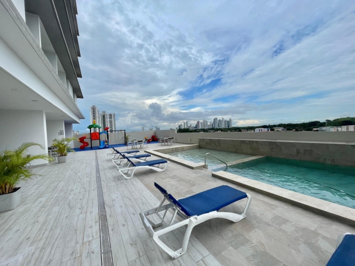 Furnished Apartment for Rent in Parque Lefevre - PH Alegría PH Alegría has an excellent strategic location on Vía España, close to supermarkets, pharmacies, bakeries, restaurants and minutes from Costa del Este and San Francisco, due to its different access routes and public transportation. The apartment has: 66m2, 2 bedrooms, 2 full bathrooms, 1 parking, White Line, Inverter air conditioners, Open kitchen with granite countertops, Modern furniture, Lamps and blinds, Remodeled, Balcony. The building has a social area, party room, gym, swimming pool, playground, lobby, power plant, water tank, power plant, visitor parking and 24 hour security.