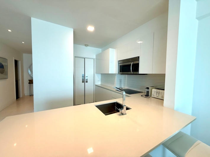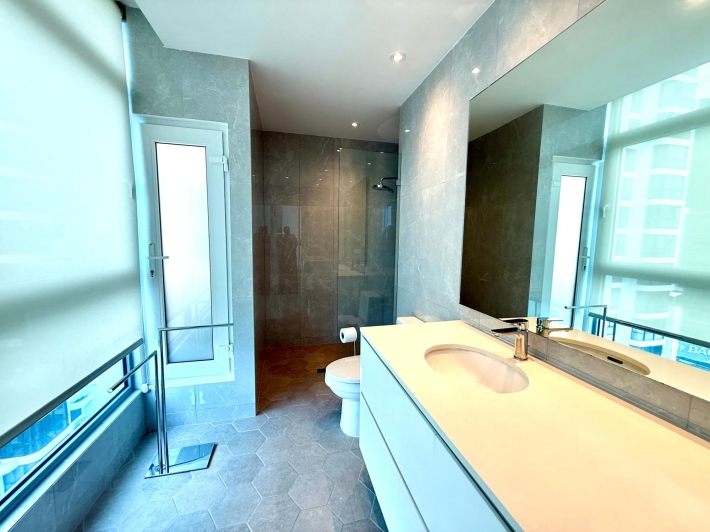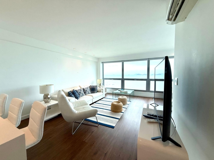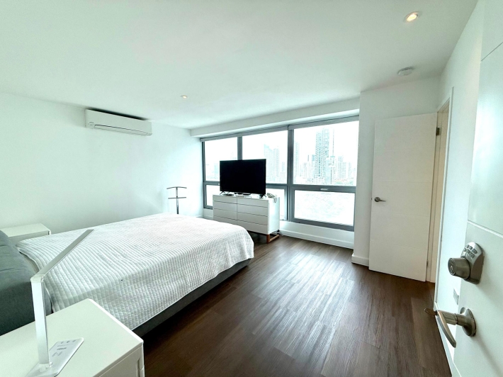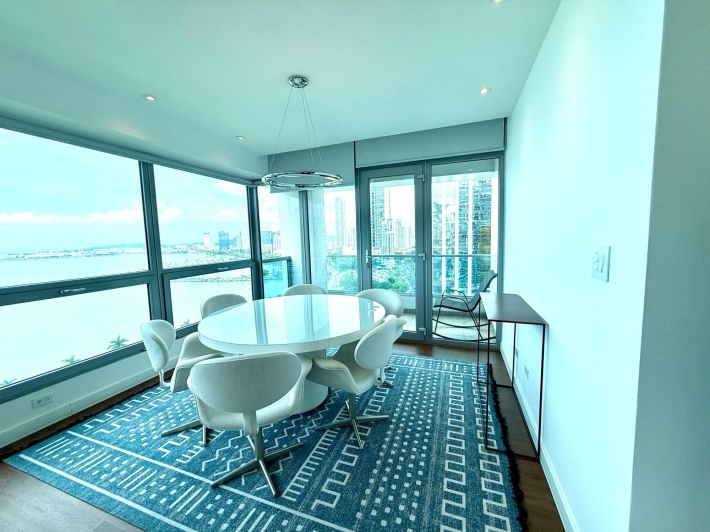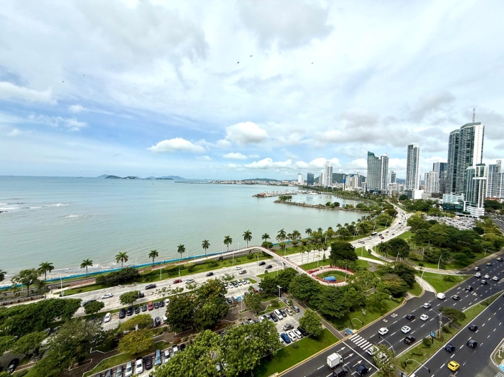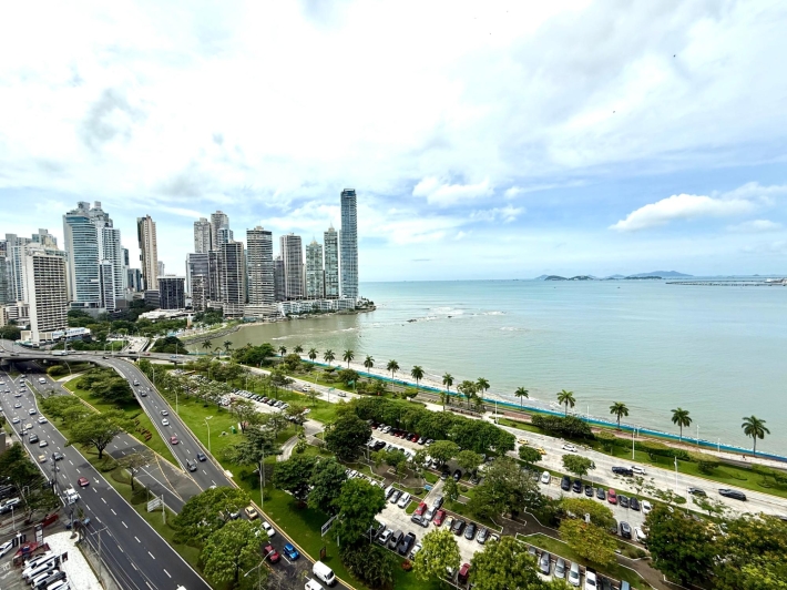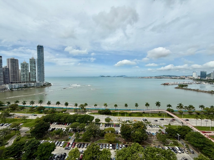 Beautifully remodeled apartment in a Bayfront building. Kitchen, bathroom, windows, and flooring have all been updated. It boasts stunning views of Balboa Avenue, yet is quieter thanks to the new double-glazed windows. Features include hardwood floors, a beautiful new kitchen with quartz countertops and a built-in electric cooktop, and electric blinds in the living room and master bedroom. The spacious living room and master bedroom offer breathtaking views of Panama Bay.