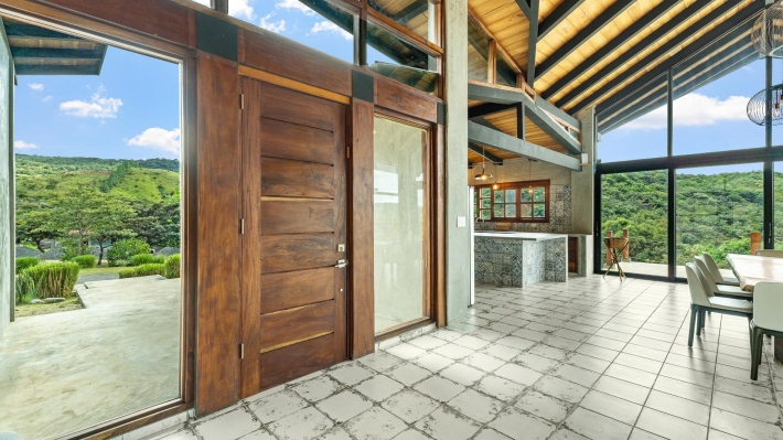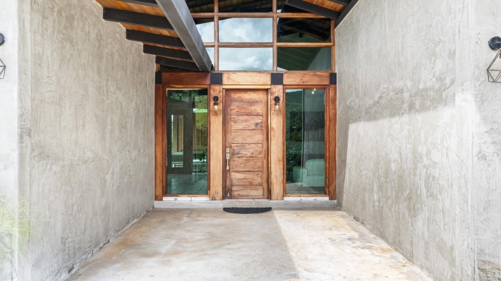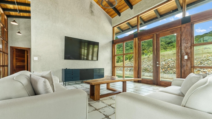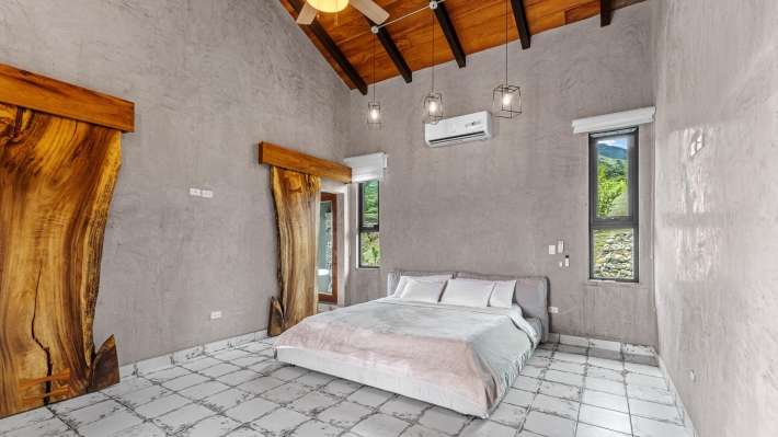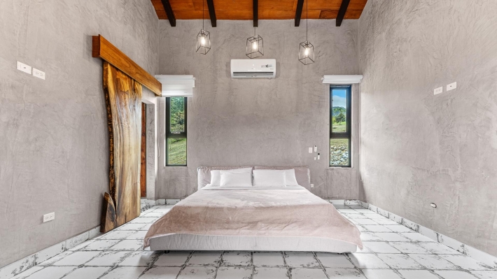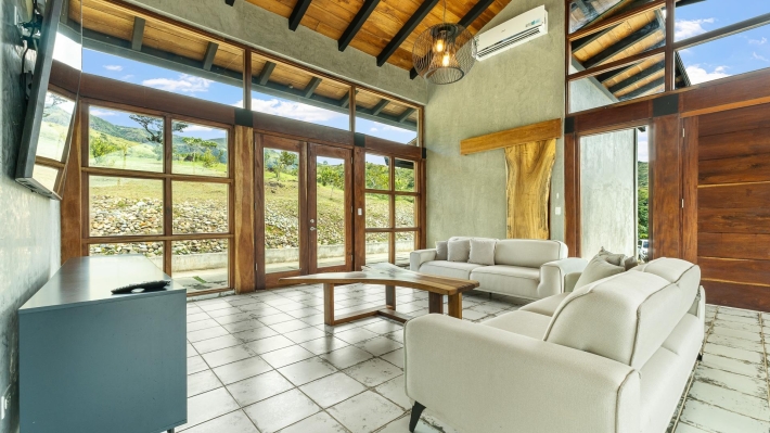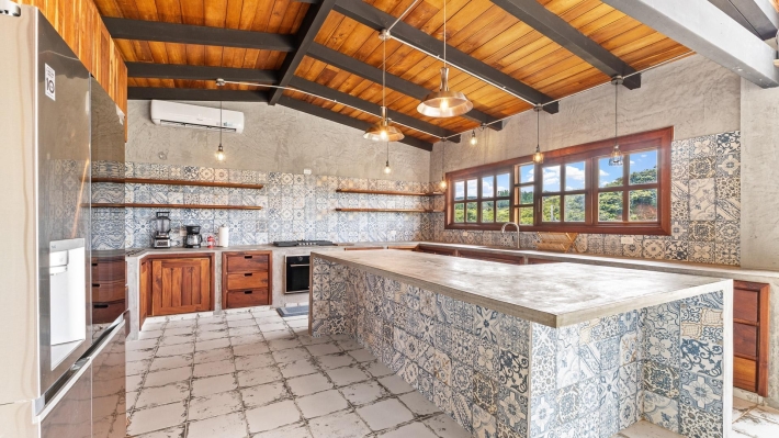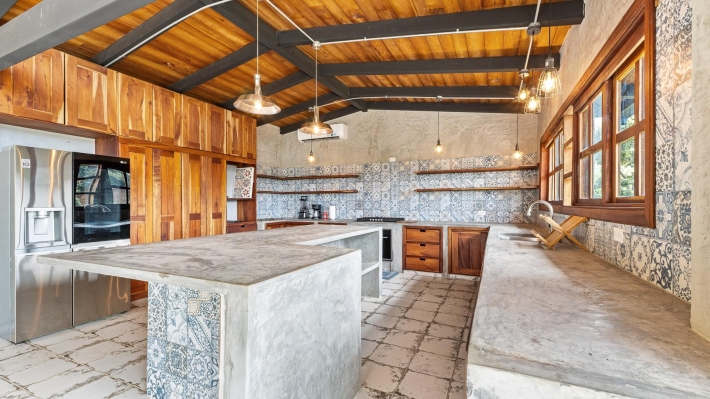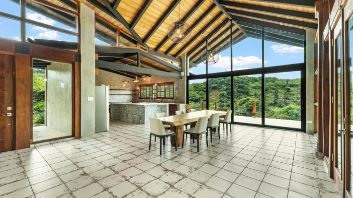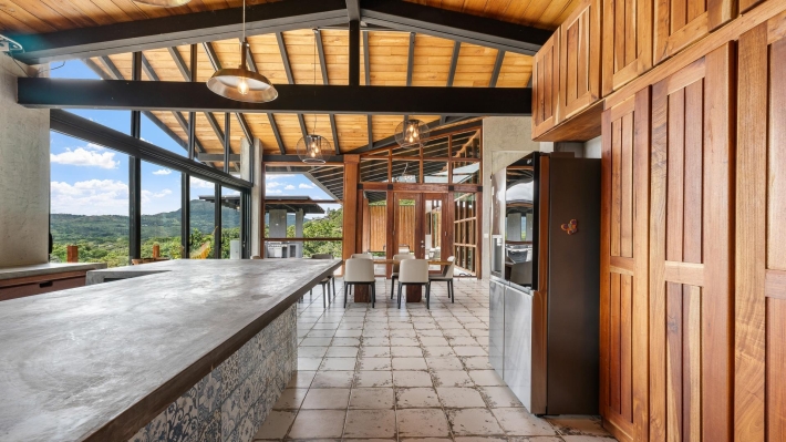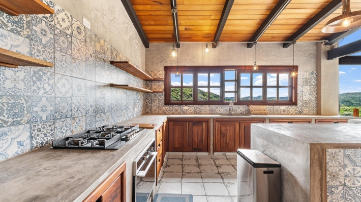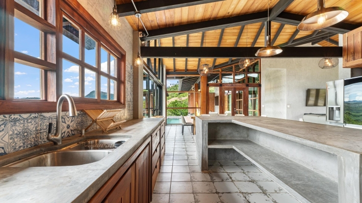 Now available for sale in Santa Fe is this modern mountain home located inside Namuiki, the first and only residential development of its kind in the area. This community is being built with proper roads, real infrastructure, on-site management, and wellness-oriented amenities like a spa, hiking trails, saunas, a cold plunge, a yoga room, and even a paddle court. It’s set up to provide a high-quality living experience in a part of Panama that still feels natural, quiet, and spacious. The home sits approximately on a 6397m2 lot (exact size coming soon) with a gentle, consistent slope. Nearly all of the land is usable, giving you room for planting, gardening, and even building additional structures above the existing home. The flattened area where the house sits was intentionally chosen to capture west-facing views that deliver beautiful sunsets over the surrounding mountains. Inside, the house has a warm yet minimal aesthetic. Microcement walls, local exotic hardwoods, and carefully crafted finishes define the interiors. The ceilings are tall, the natural light is abundant, and the overall design balances modern comfort with a grounded, mountain feel. The home was recently completed and has not been lived in, and the furniture was just purchased, so everything feels fresh and new. The open-concept kitchen and living area creates a seamless flow toward the outdoors. The kitchen includes custom hardwood cabinetry, an oversized island wrapped in decorative tile, open shelving, and large windows that frame the mountain views.