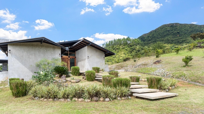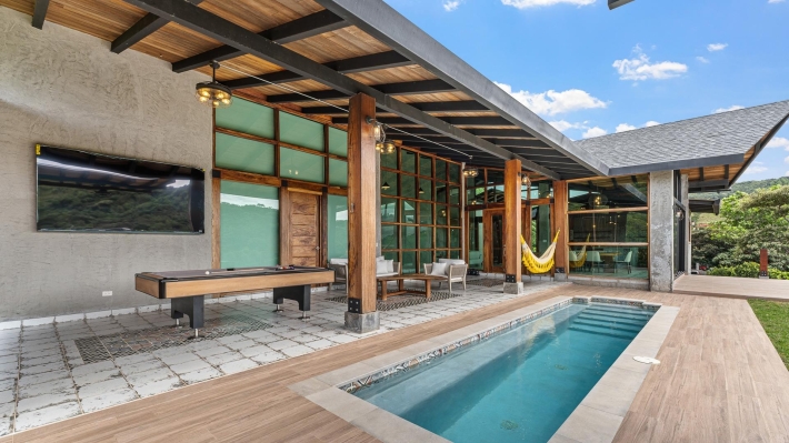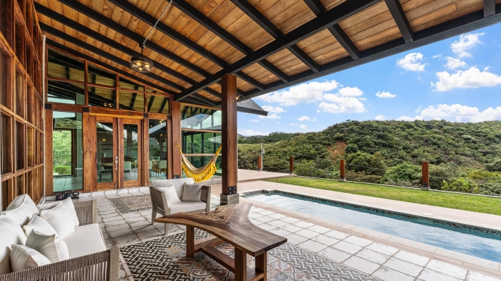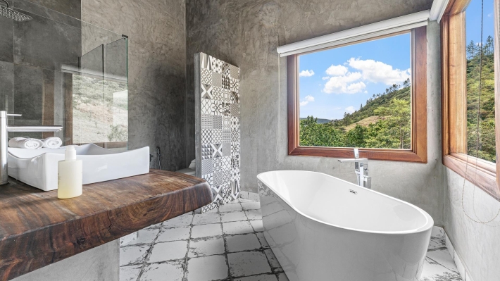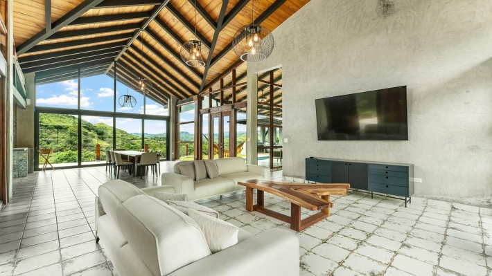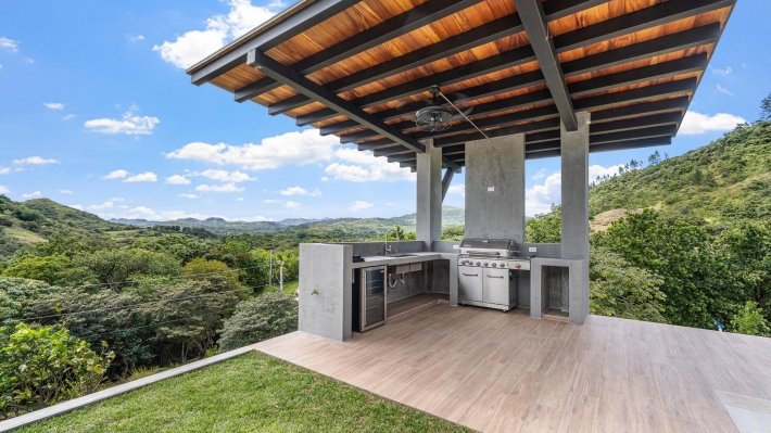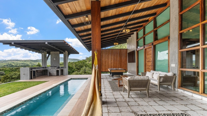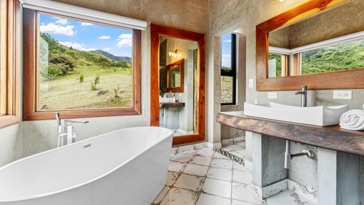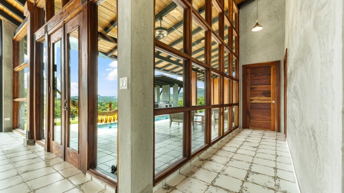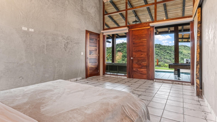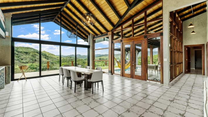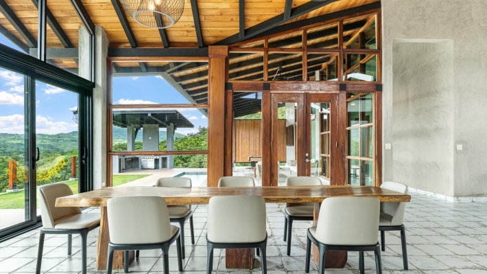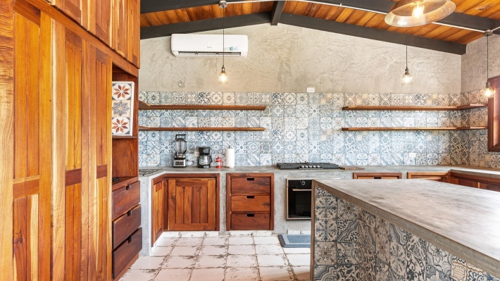 Now available for sale in Santa Fe is this modern mountain home located inside Namuiki, the first and only residential development of its kind in the area. This community is being built with proper roads, real infrastructure, on-site management, and wellness-oriented amenities like a spa, hiking trails, saunas, a cold plunge, a yoga room, and even a paddle court. It’s set up to provide a high-quality living experience in a part of Panama that still feels natural, quiet, and spacious. The home sits approximately on a 6397m2 lot (exact size coming soon) with a gentle, consistent slope. Nearly all of the land is usable, giving you room for planting, gardening, and even building additional structures above the existing home. The flattened area where the house sits was intentionally chosen to capture west-facing views that deliver beautiful sunsets over the surrounding mountains. Inside, the house has a warm yet minimal aesthetic. Microcement walls, local exotic hardwoods, and carefully crafted finishes define the interiors. The ceilings are tall, the natural light is abundant, and the overall design balances modern comfort with a grounded, mountain feel. The home was recently completed and has not been lived in, and the furniture was just purchased, so everything feels fresh and new. The open-concept kitchen and living area creates a seamless flow toward the outdoors. The kitchen includes custom hardwood cabinetry, an oversized island wrapped in decorative tile, open shelving, and large windows that frame the mountain views.