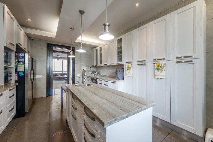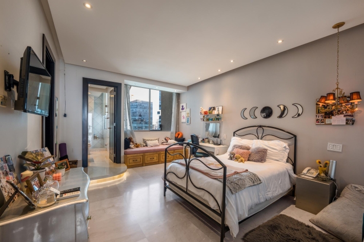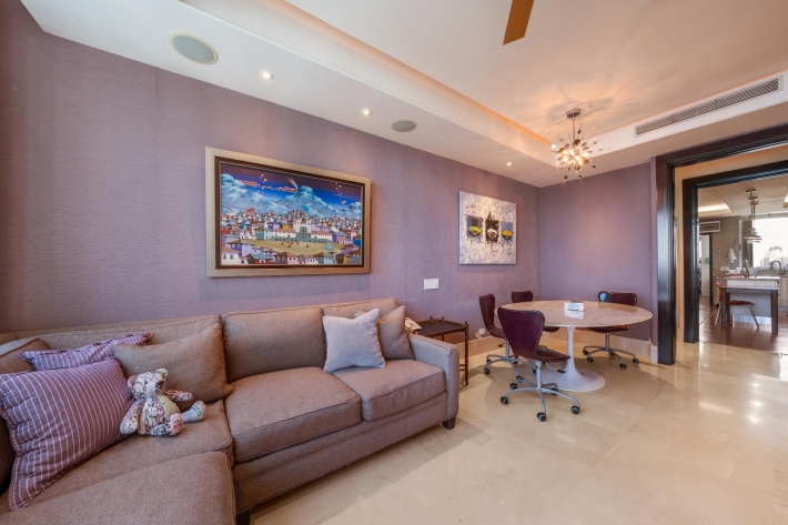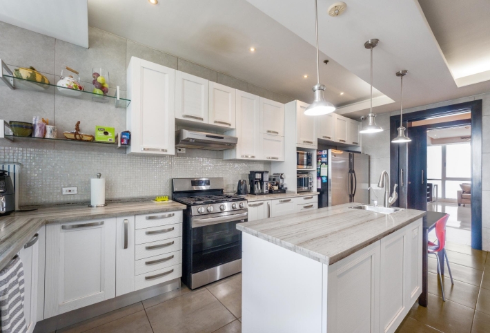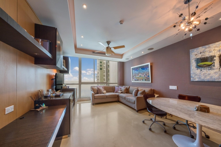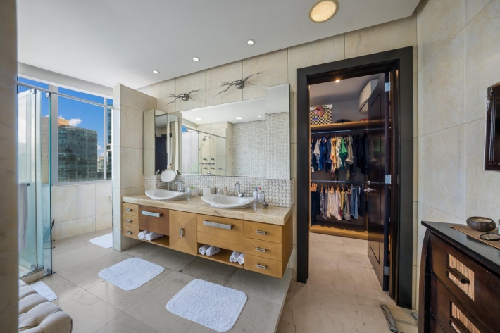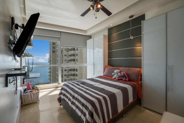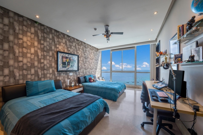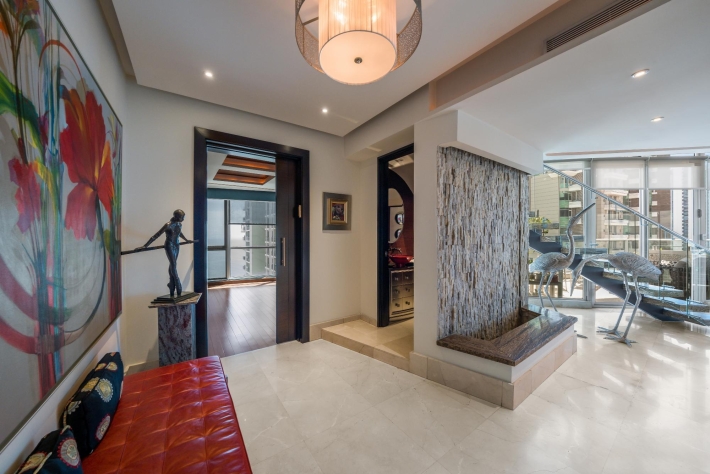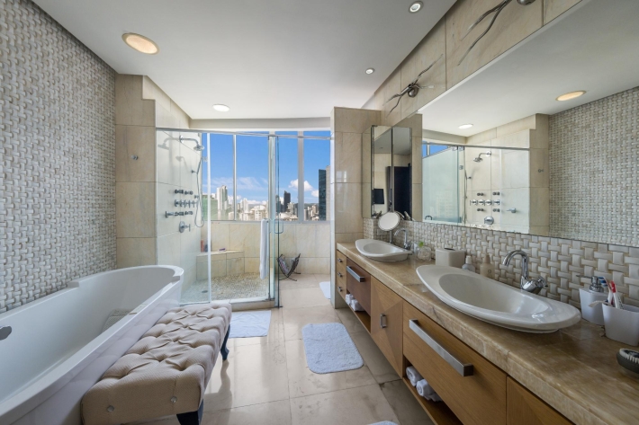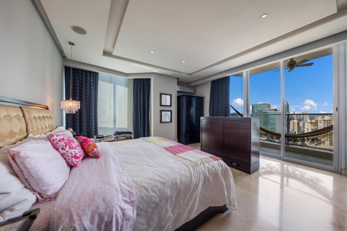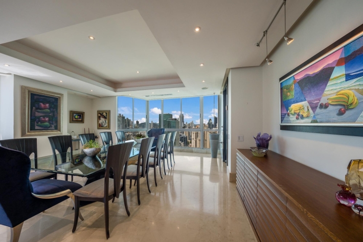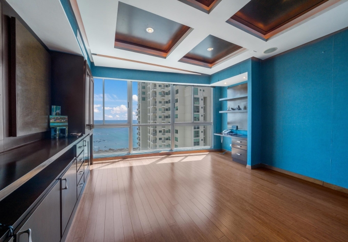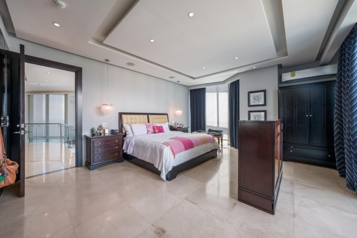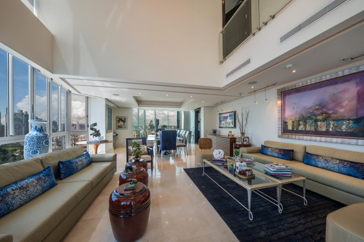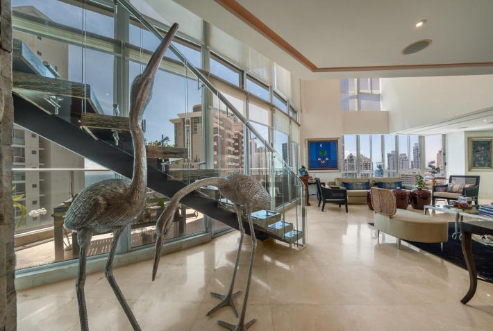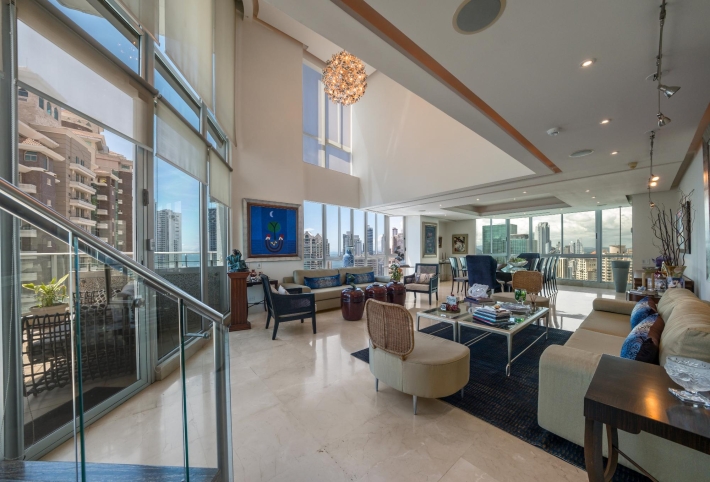 The Skyline Penthouse at Blue Bahía is a duplex penthouse in Punta Pacífica, one of Panama City’s most established oceanfront neighborhoods. From its elevated position, it frames open views of the Pacific and the city skyline, balancing privacy with immediate access to the city. The residence is organized across two levels, separating entertaining areas from bedrooms with clarity and intention. Light and perspective shape the experience throughout. The main social level is defined by a dramatic double-height volume and floor-to-ceiling windows. The living room is the true connector, linking the dining area directly to the balcony in one continuous flow. Step outside and the balcony extends the social space into open air, keeping ocean and skyline views present in every moment. The kitchen is spacious and practical, designed for daily living and casual hosting. Two separate family rooms add versatility. One is oriented to everyday family use and includes an integrated desk area. The second is conceived as a more private adult lounge and features a built-in bar for intimate gatherings. Upstairs, the private level includes three secondary bedrooms, each with its own bathroom and closet, plus an additional space between rooms for a sitting area. The primary suite offers direct access to a private balcony with open views, along with a walk-in closet and an en-suite bathroom. Designed for those who value space, calm and a top address. Contact us to schedule a private viewing.