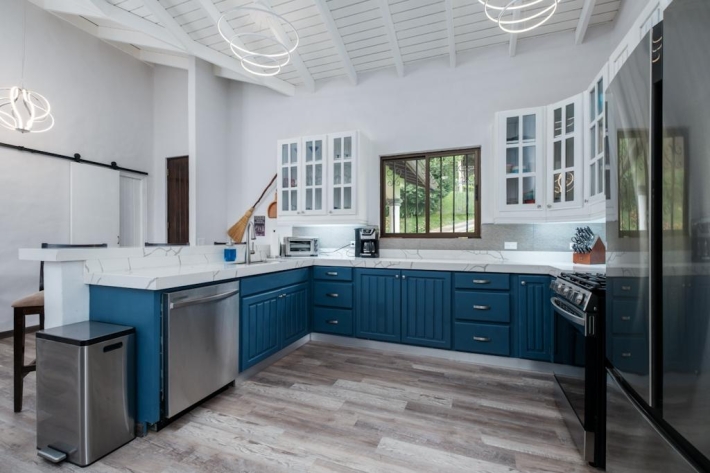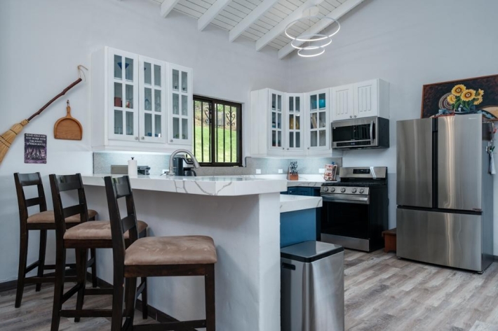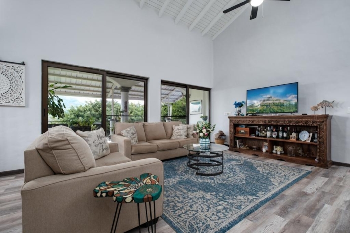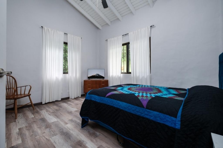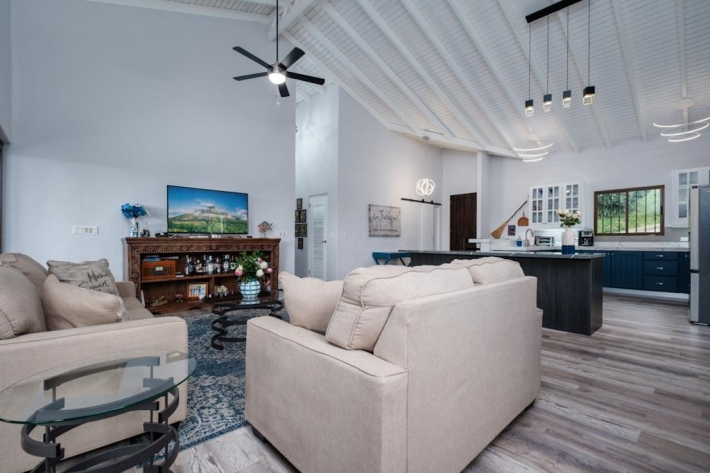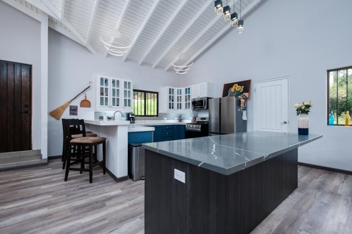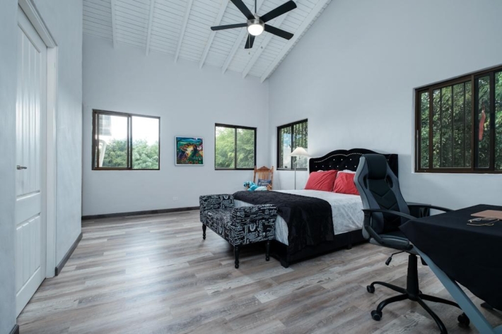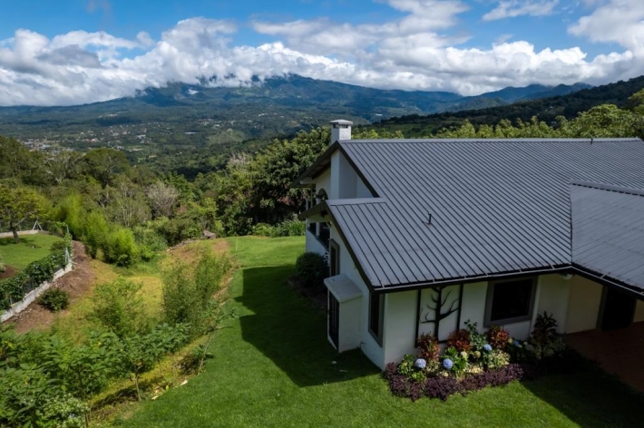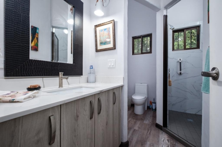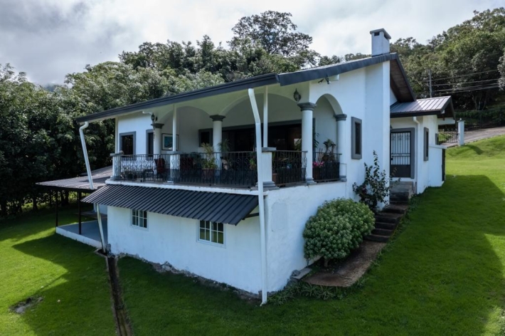 Located in the desirable hills of Jaramillo Abajo, just minutes from downtown Boquete, this beautifully renovated mountain home offers contemporary design, comfort, and stunning natural views. Set on a lush 3,690 m lot, the property enjoys privacy, elevation, and a peaceful setting. The open, light-filled living area features soaring 16-foot ceilings, modern finishes, abundant natural light, and a wood-burning fireplace. The main level includes two spacious bedrooms and two modern bathrooms, including a well-appointed primary suite. The lower level offers a fully updated bedsitting room with a new kitchenette and bathroom, providing excellent flexibility for guests, extended family, or private living space. Outdoor living is highlighted by a covered terrace ideal for relaxing or dining while taking in the mountain surroundings. Thoughtfully updated and well located, this home delivers a rare blend of tranquility, functionality, and convenience close to town.