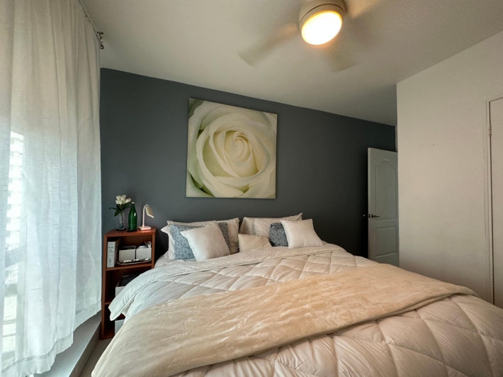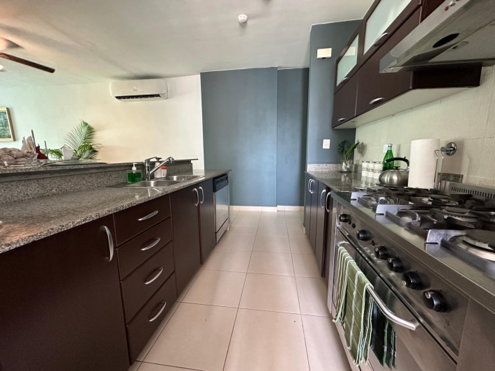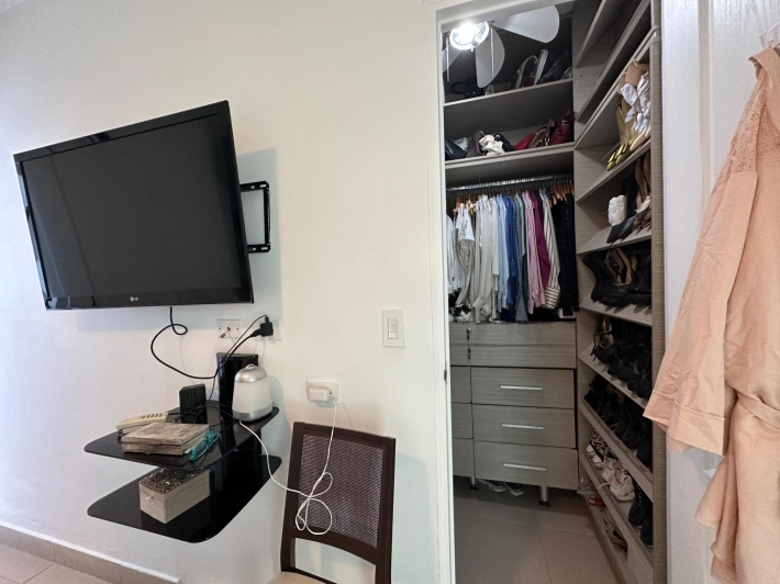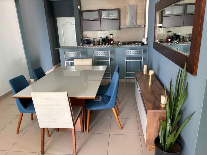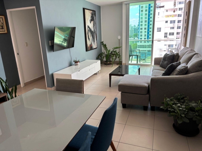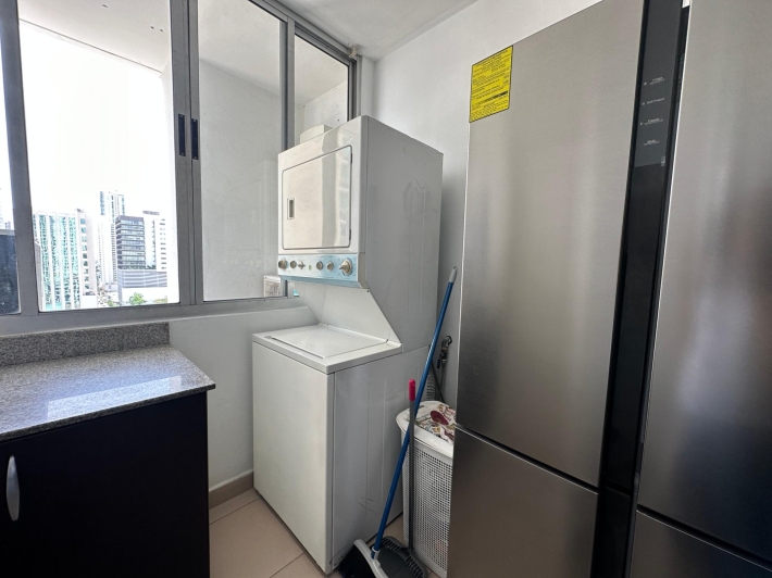 Available for rent in March 2026. Furnished and fully equipped, remodeled, 97 m2, 2 bedrooms, 3 full bathrooms. Master bedroom with ensuite bathroom and double closet. Second bedroom with walk-in closet and desk. Full secondary bathroom. Beautiful city view. Balcony. Living/dining room. Split inverter air conditioners. Open laundry room with service bathroom. Fully equipped integrated kitchen with inverter refrigerator. Blackout curtains in bedrooms. Ceramic tile floors. Open kitchen with complete appliances, including dishwasher. 1 covered parking space. Building with recreational areas including pool, gym, playground, event room, 24/7 security, and visitor parking. Rent: $1400