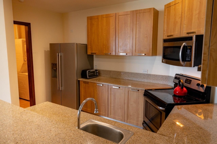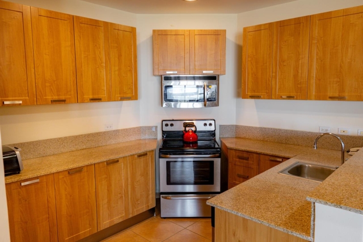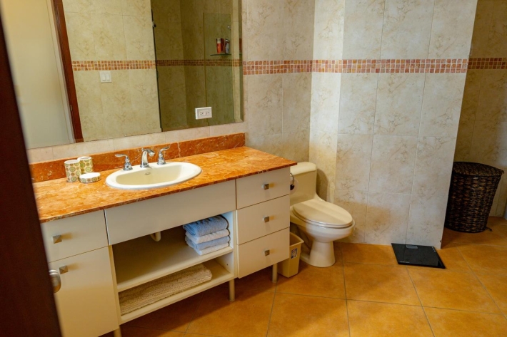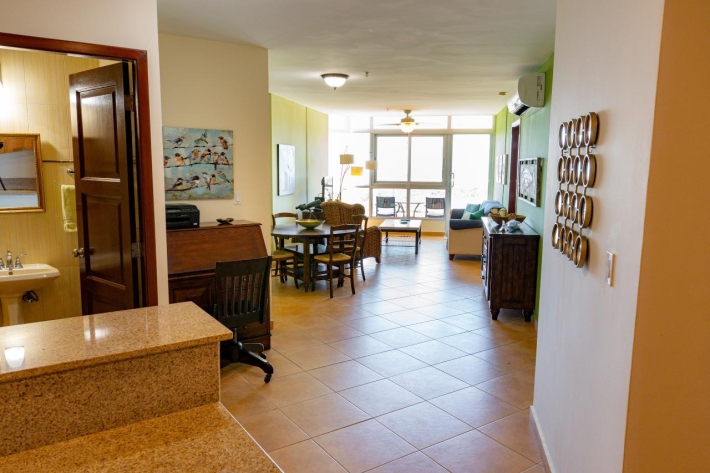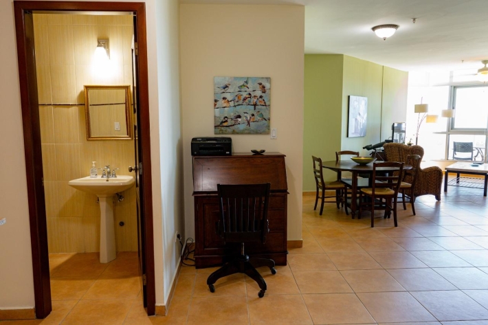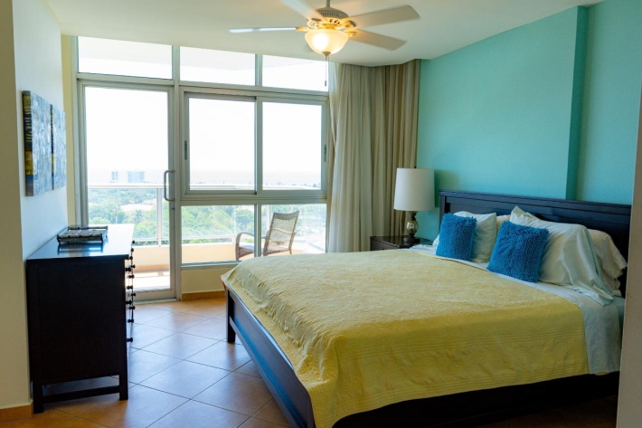 This 15th floor apartment located in Coronado Golf Tower offers expansive views across the golf course of the Pacific Ocean during the storm season and tranquil sunrises in the tropical summer from the main room, bedroom, and spacious un-obstructed balcony. The apartment offers the following amenities: Spacious great room with stunning views of the Pacific Ocean and golf course, comfortable sofa, rattan wing chair, coffee table, entertainment unit for the TV and a spacious dining area with a round table for 4 Sunshades on the expansive windows Tasteful color scheme throughout Fully equipped kitchen with granite counter tops, dishwasher, fridge, range, microwave, laundry closet with a sink and laundry center washer/dryer Spacious master bedroom with a King-sized bed The master suite has a walk-through closet and private bathroom with a large shower and soaker tub Black-out curtains in the bedroom. Spacious Balcony with mountain, golf course and ocean views