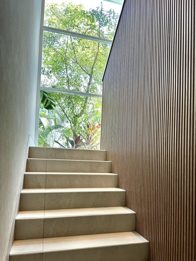 • Living and dining areas with double-height ceilings