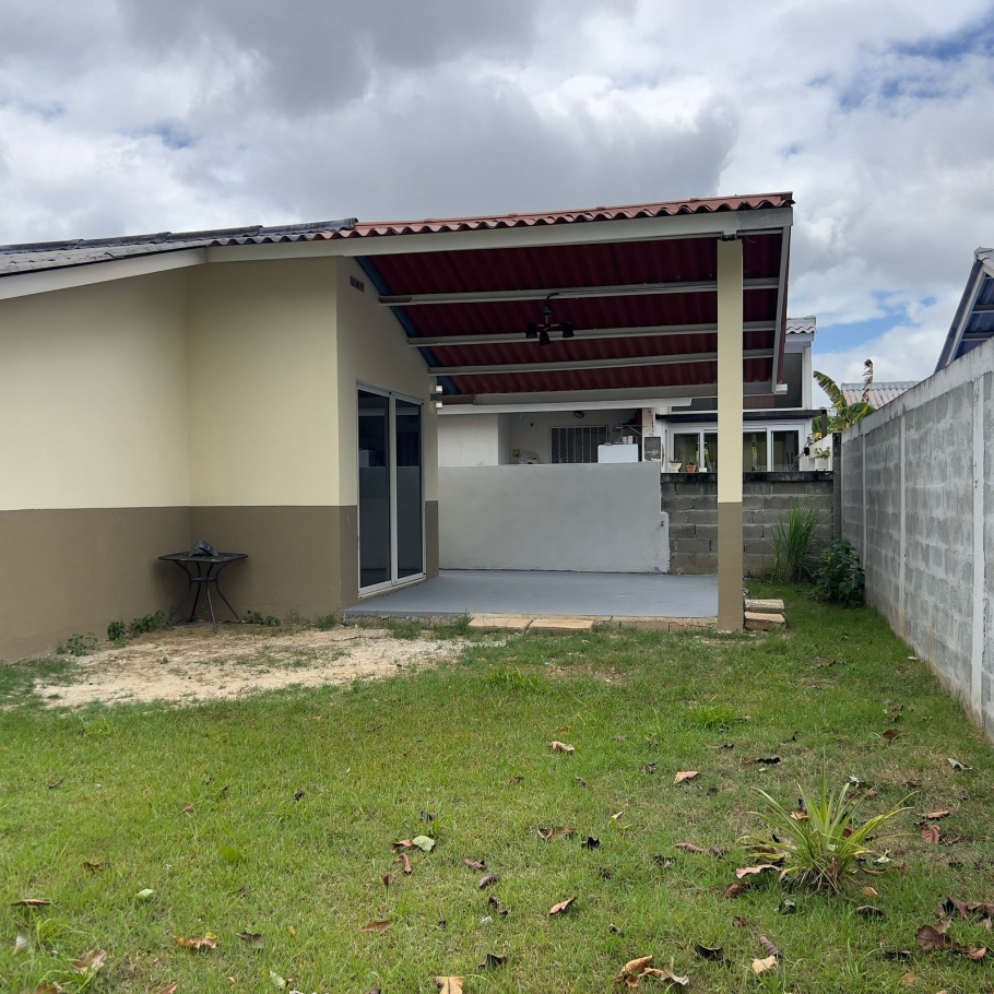 The home has two air conditioning units, one in the living room and one in the master bedroom, ensuring comfort in every room. It also includes a covered laundry area, a covered terrace ideal for entertaining, with a side area designated for drying clothes, and a patio perfect for enjoying the outdoors.