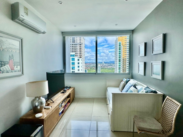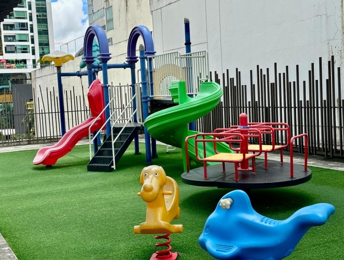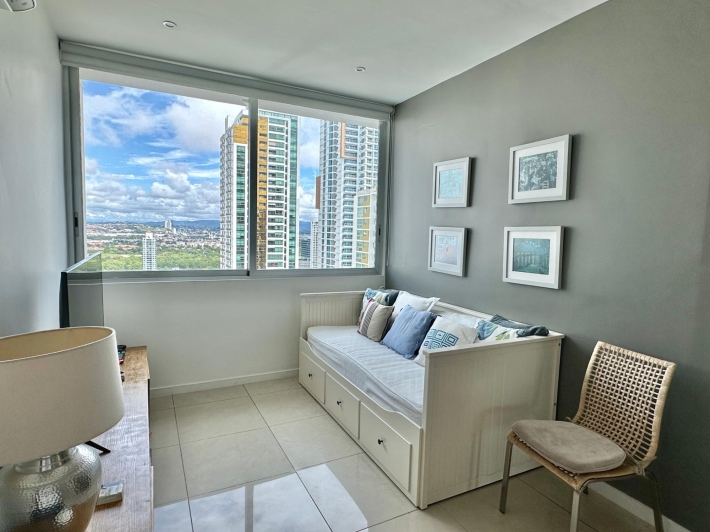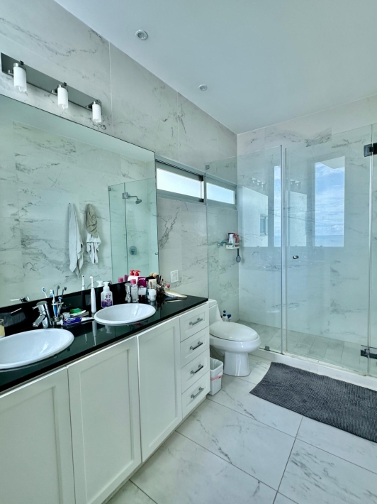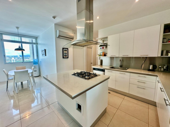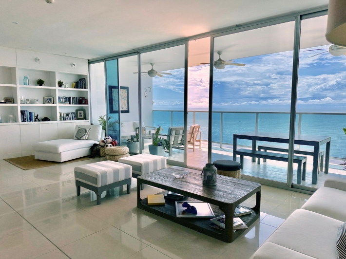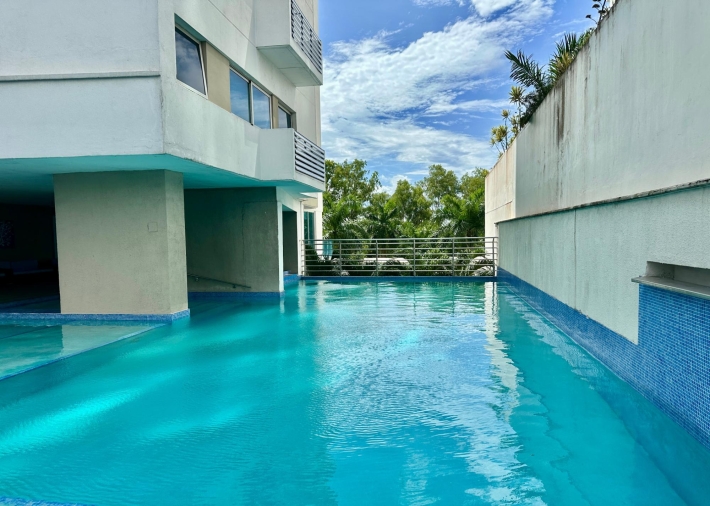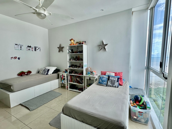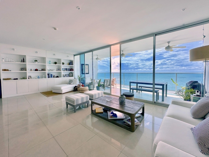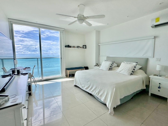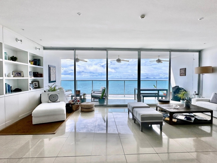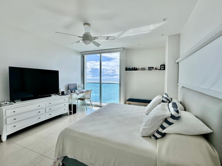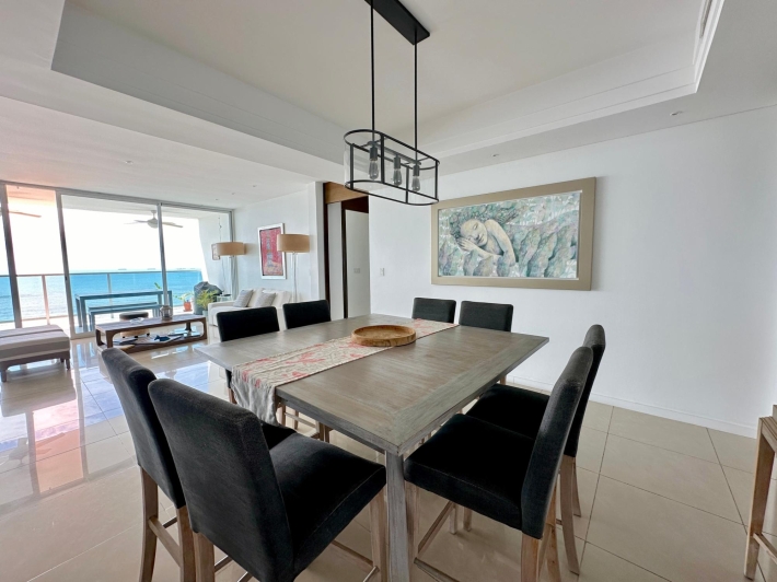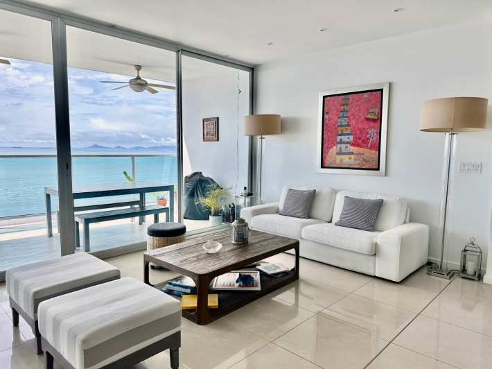 This 265 sq m (2,900 sq ft) apartment boasts spacious rooms with a comfortable and functional layout. It features three bedrooms, each with its own full bathroom, plus a guest bathroom, an open-plan living and dining area, a family room, and a beautiful balcony with ocean views that adds a sense of spaciousness and natural light. The property includes a kitchen with a breakfast bar, a laundry room, a maid's quarters with a bathroom, three parking spaces, and a storage unit. The building offers a full range of amenities such as a swimming pool, gym, social area, event room, children's play area, 24/7 security, and visitor parking, making it ideal for those seeking comfort, spacious living, and oceanfront living.