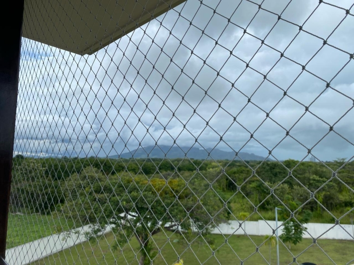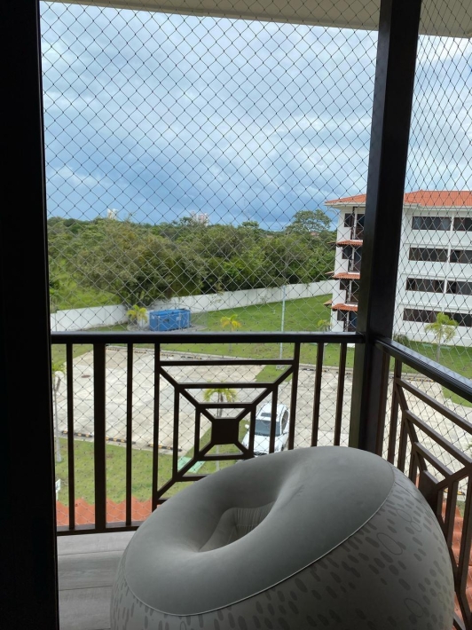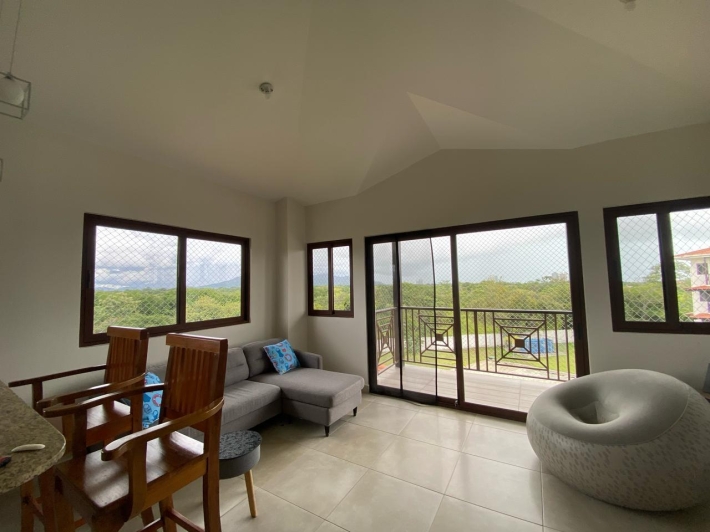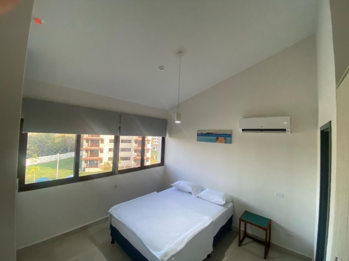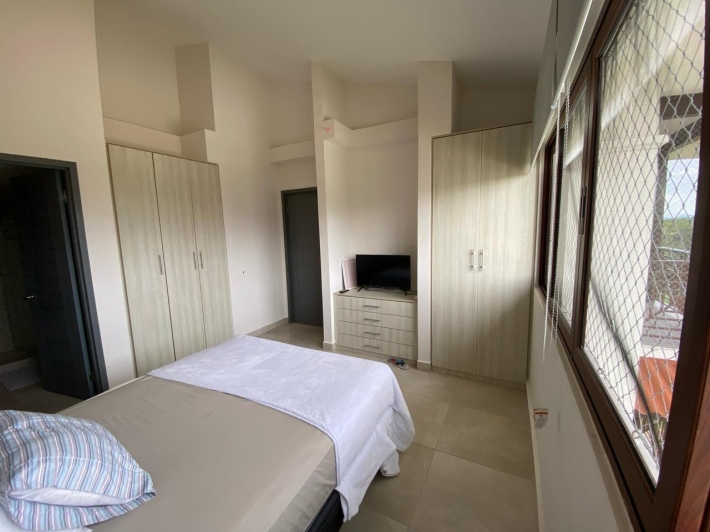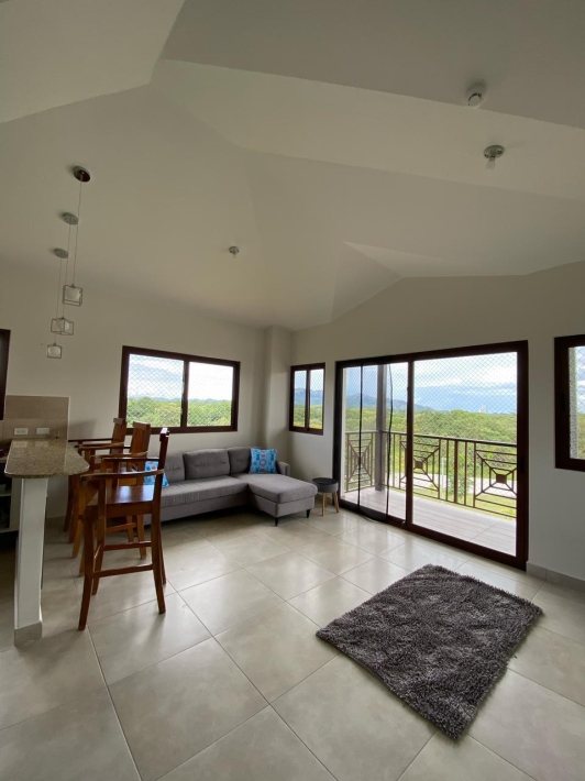 Apartment with mountain views and minimalist decor. The placement of windows and doors allows for cross-ventilation, making it a cool apartment. This is where the tower's name, Alisios, comes from.