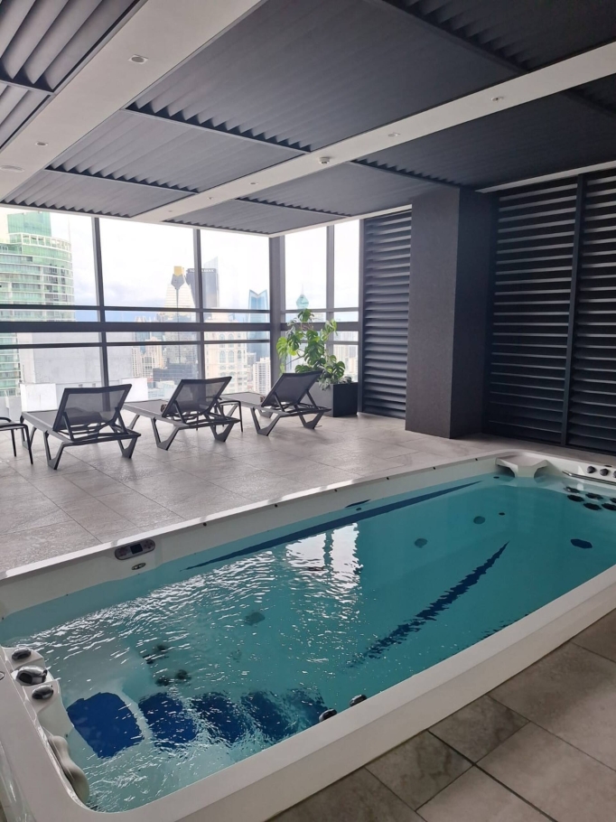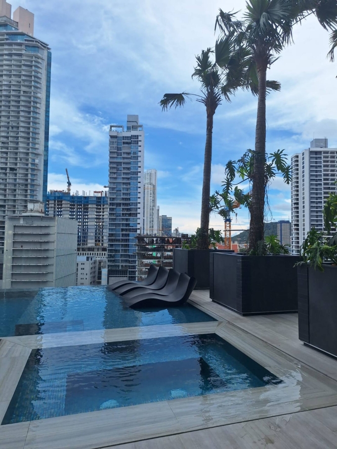 . Level 8 (Main Social Area) Designed for relaxation and entertainment: Infinity pool with ocean views Resistance pool for training Private cabanas, terraces, and modern jacuzzis Restaurant and cocktail/snack bar with poolside service.