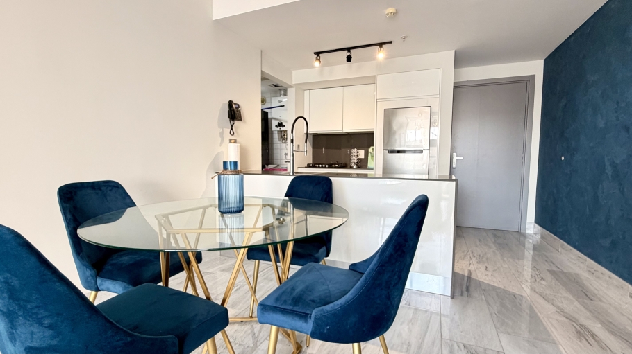 . Interior Design: Apartments feature high-end finishes such as marble floors, Italian Berloni kitchens, premium fixtures, and floor-to-ceiling windows with city or ocean views. Layout: