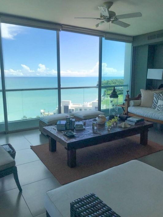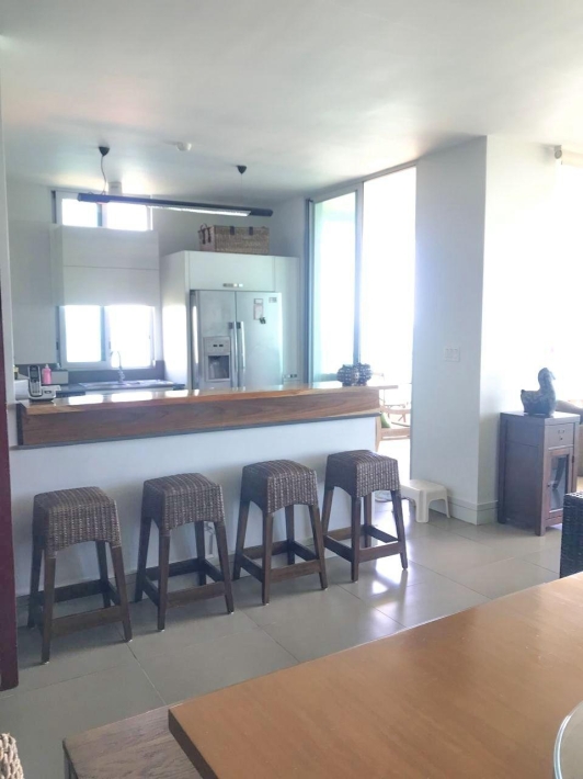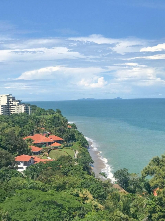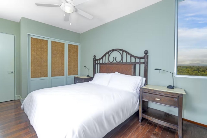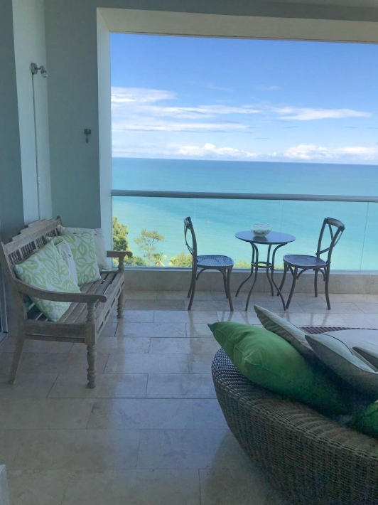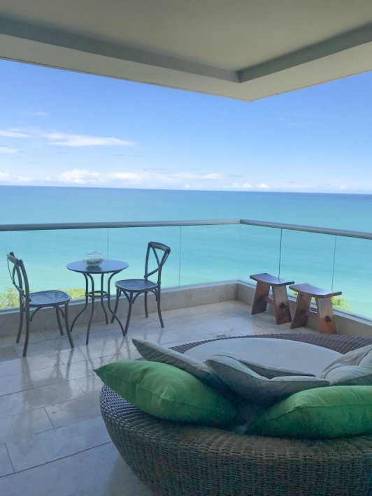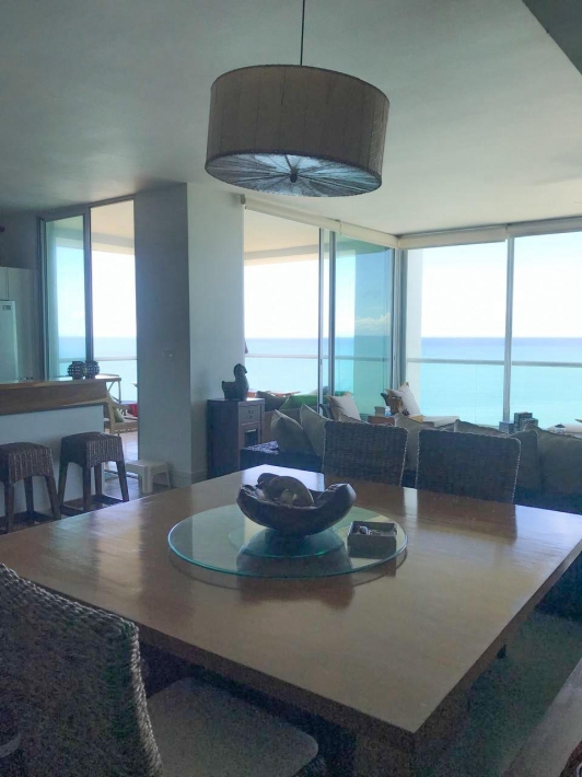 Exclusive and luxurious oceanfront apartment with stunning views of the Pacific Ocean and mountains. Two bedrooms: master with balcony and ensuite bathroom, second bedroom with two double beds. Two full bathrooms plus a powder room. Spacious living and dining area and corner balcony with panoramic ocean views. Equipped kitchen, laundry room, and maid's quarters. Central air conditioning, appliances, and excellent ventilation. Amenities include four swimming pools, a gym, a spa, an event room, 24/7 security, and access to the beach and river.