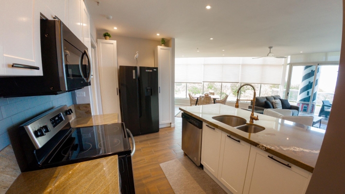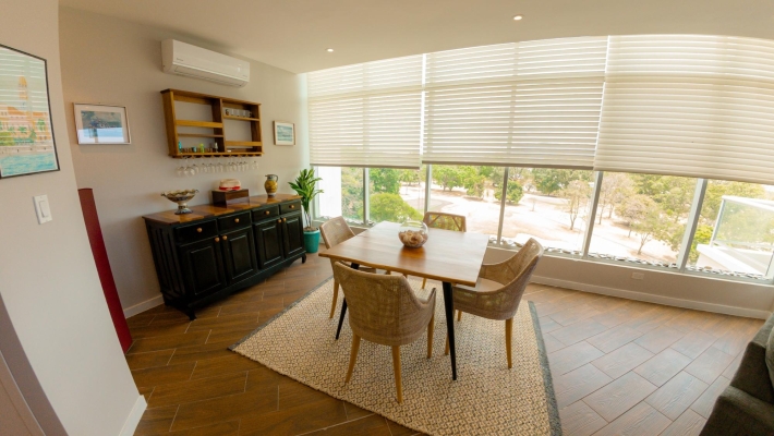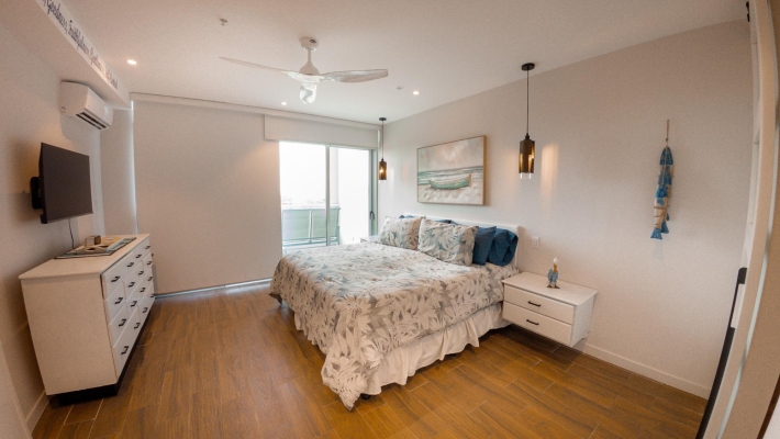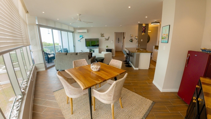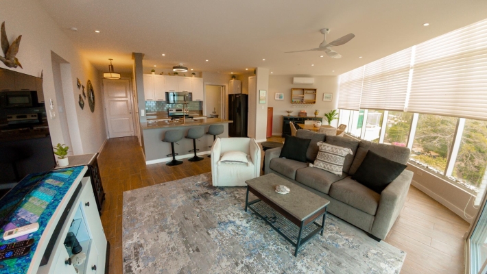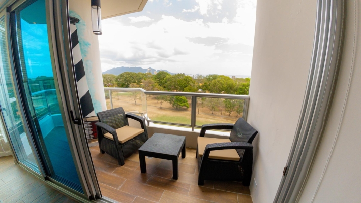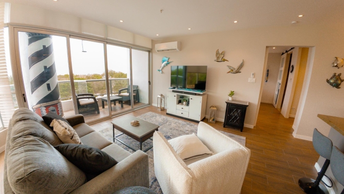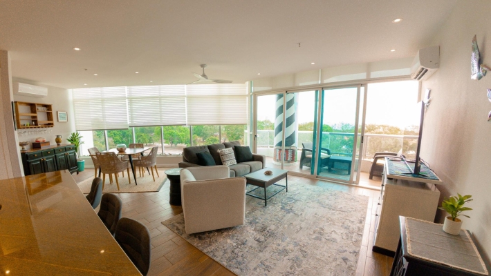 Perched on the 8th floor, this refined 1-bedroom residence offers a rare sense of privacy and elevation, with sweeping views over the golf course. Designed for effortless indoor-outdoor living, the home features two private balconies - one extending from the main living area, the other from the bedroom—creating two distinct spaces to unwind, entertain, or take in the coastal surroundings. Clean architectural lines, floor-to-ceiling glass, and a thoughtfully designed 110 m² layout give the space a bright, modern feel, while the spacious primary suite with its own balcony and ensuite delivers a quiet, retreat-like experience.