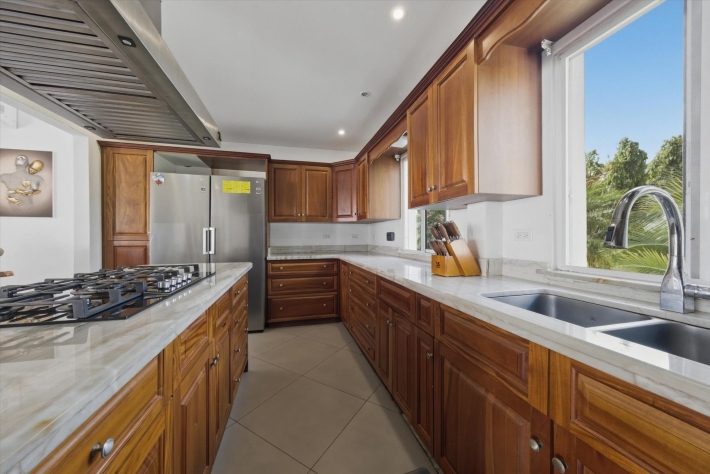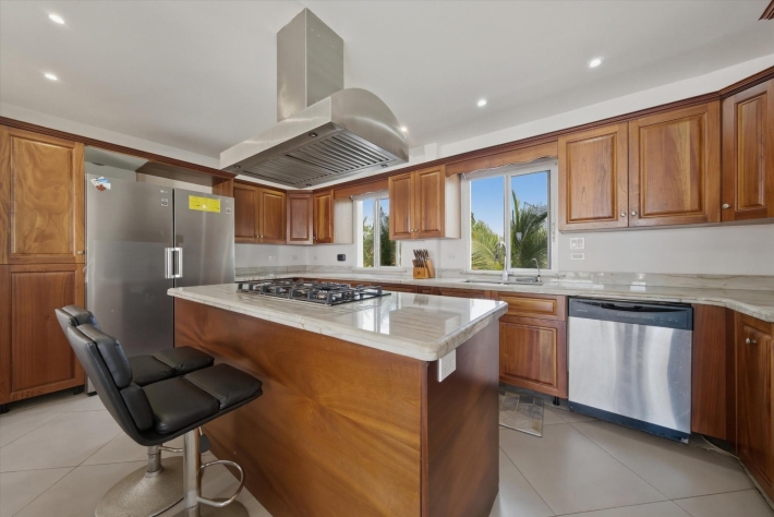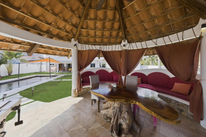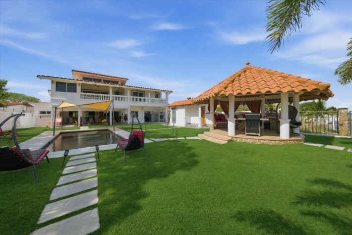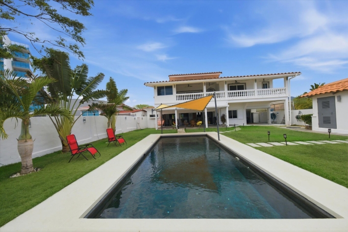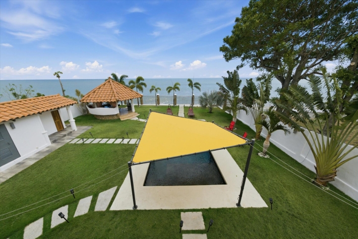 OCEANFRONT ESTATE — PLAYA MALIBU, PANAMA List Price: $950,000 | 5 Bed | 6 Bath + 3 Half | 2-Car Garage | 297 m² Built | 1,250 m² Lot | Built 2018 Set directly on the sand at Playa Malibu, this two-story estate delivers 229 m² of interior living space across two floors, plus a separate circular dining pavilion — all on a fully walled, gated oceanfront lot steps from private beach access. The ground floor opens through folding glass walls to a covered terrace (32 m²), blurring the line between interior and outdoor living. The kitchen features a gas island cooktop, marble countertops, solid hardwood cabinetry, and stainless steel appliances. A solid live-edge dining table anchors the open-plan living and dining area. Two bedrooms and two full baths complete the ground floor. Upstairs, three bedrooms — the largest over 25 m² — share 35.9 m² of ocean-facing balcony space. A dedicated home office with ocean exposure and multiple full and half-baths round out the second floor. Outdoors, a lap pool with shade sails and lounge chairs sits at the center of a manicured lawn. A thatched open-air gazebo with full BBQ kitchen serves as the entertainment hub. A reinforced seawall over 10 meters high protects the entire property. The beach beyond is one of Panama's longest uninterrupted stretches — over 8 km of walkable Pacific shoreline reaching the Chame River. Built in 2018. Fully furnished. Move-in ready. Two-car garage. Caretaker casita on site. At $950,000 — finished construction on direct oceanfront land — this represents a rare opportunity that cannot be replicated at this price point.