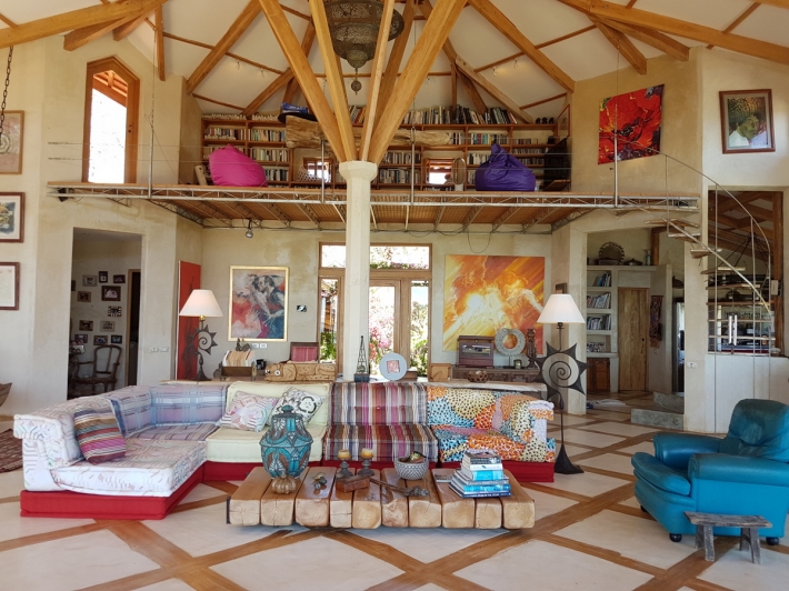 The villa has an impressive living room of ca. 100m2 with 3 harmonica-doors of each 3m high by 5m wide, which "brings the outdoors inside" and give access to the covered terras with its incredible panoramic views. Part of the living is covered by an open mezzanine where a beautiful floating desk and library is located. From here there is access to an outside terras.