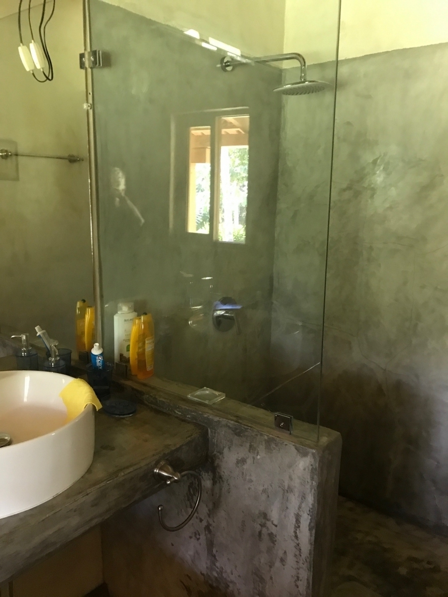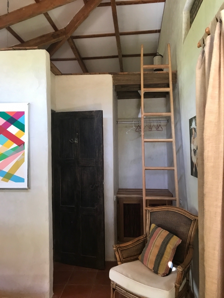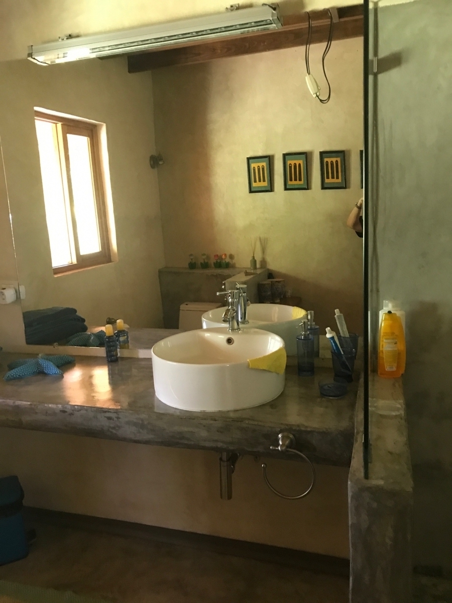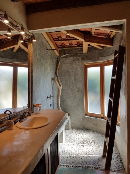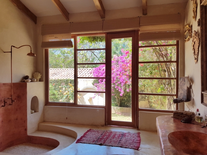 The main bedroom is connected through the dressing-area with 2 full bathrooms, each of which have access to a flower-covered courtyard. Shower in- or outside!