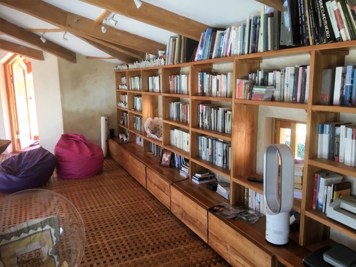 The covered parking has a tool-room and battery-storage for the solar back-up system. Further towards the entrance road is another covered area for another parking, wood storage and wood working area.
