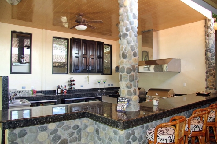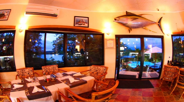 It has with teak furnishing and seats 36 guests and the circular teak bar 15. A terrace overlooks the infinity pool with pool bar, both offering a fantastic view over the water to the mainland. This is from where you can climb the look-out. A heated jacuzzi is elevated above the pool. The restaurant is served by a fully-equipped kitchen which has a cool room, storage areas, professional ice machines, 2 fridges and ceramic floor-to-ceiling tiles.