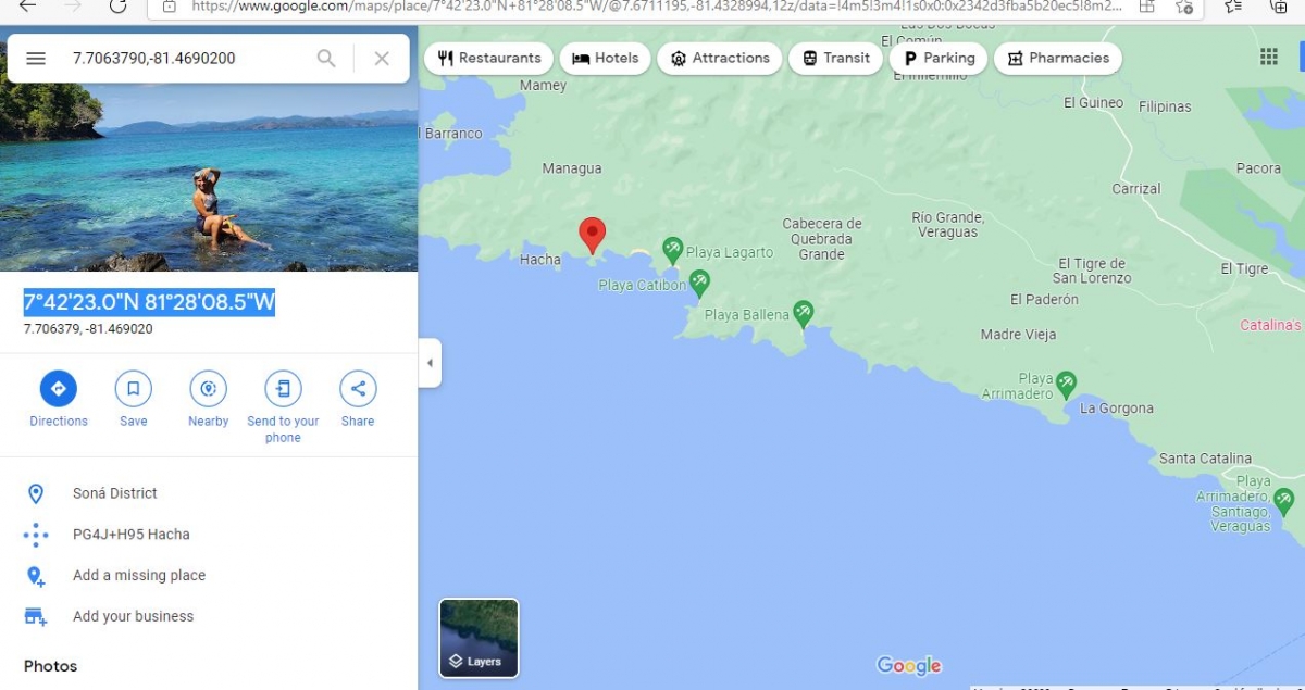 La propiedad tiene 14,5 hectáreas, 35,83 (Acres). Está en la orilla del Océano Pacífico, en la playa de Naranjito, cerca de la playa de Arrimadero en la región de Sona, Veraguas.