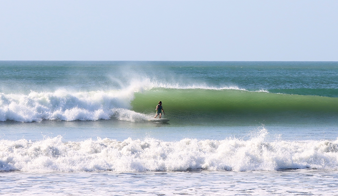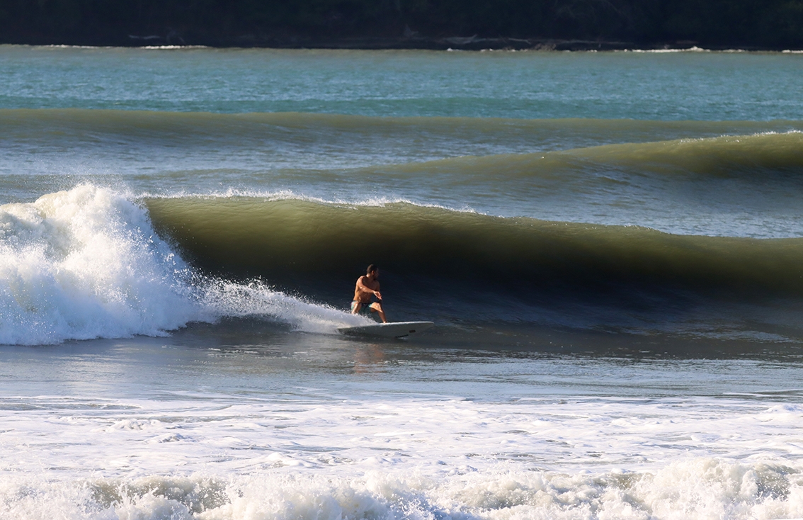 Excelente beachbreak, (todo el tiempo con más tamaño que Venao) no saturado de gran swell ( más swell, olas más largas. Cuando es mayor de 6 pies hay una izquierda de más de 100 metros (y se puede llegar al line up sin comerse la parte protegida de la bahía), una derecha tubular en marea baja en la punta de la bahía (ver foto), y 14 km de playa virgen llena de spots secretos (reef breaks estilo Bastimentos long beach) algunos son fáciles otros son fuertes y tubulares.