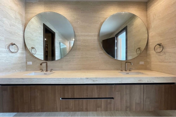 Cocina de diseño europeo con isla y tope en cascada Baños con espejos decorativos