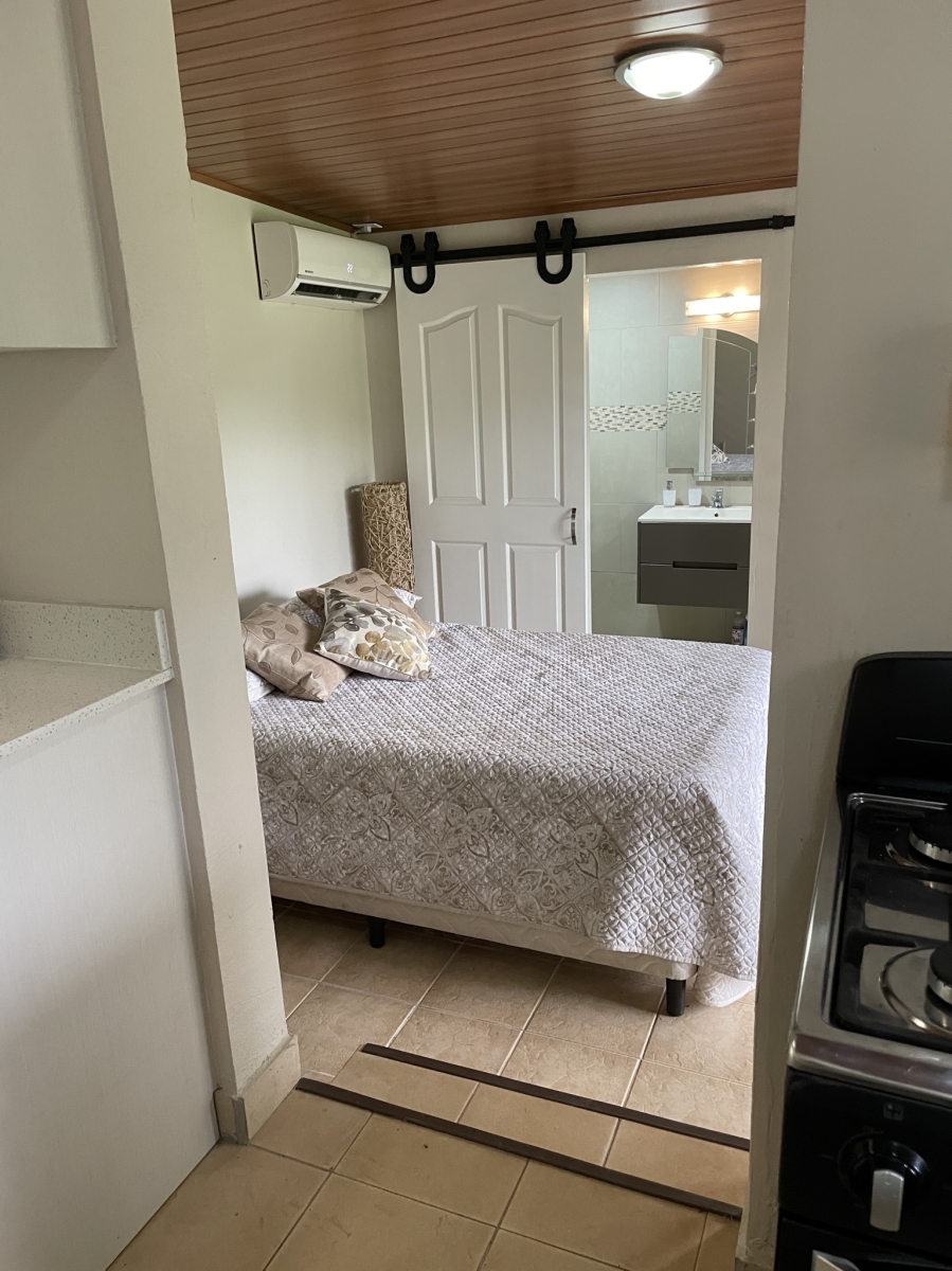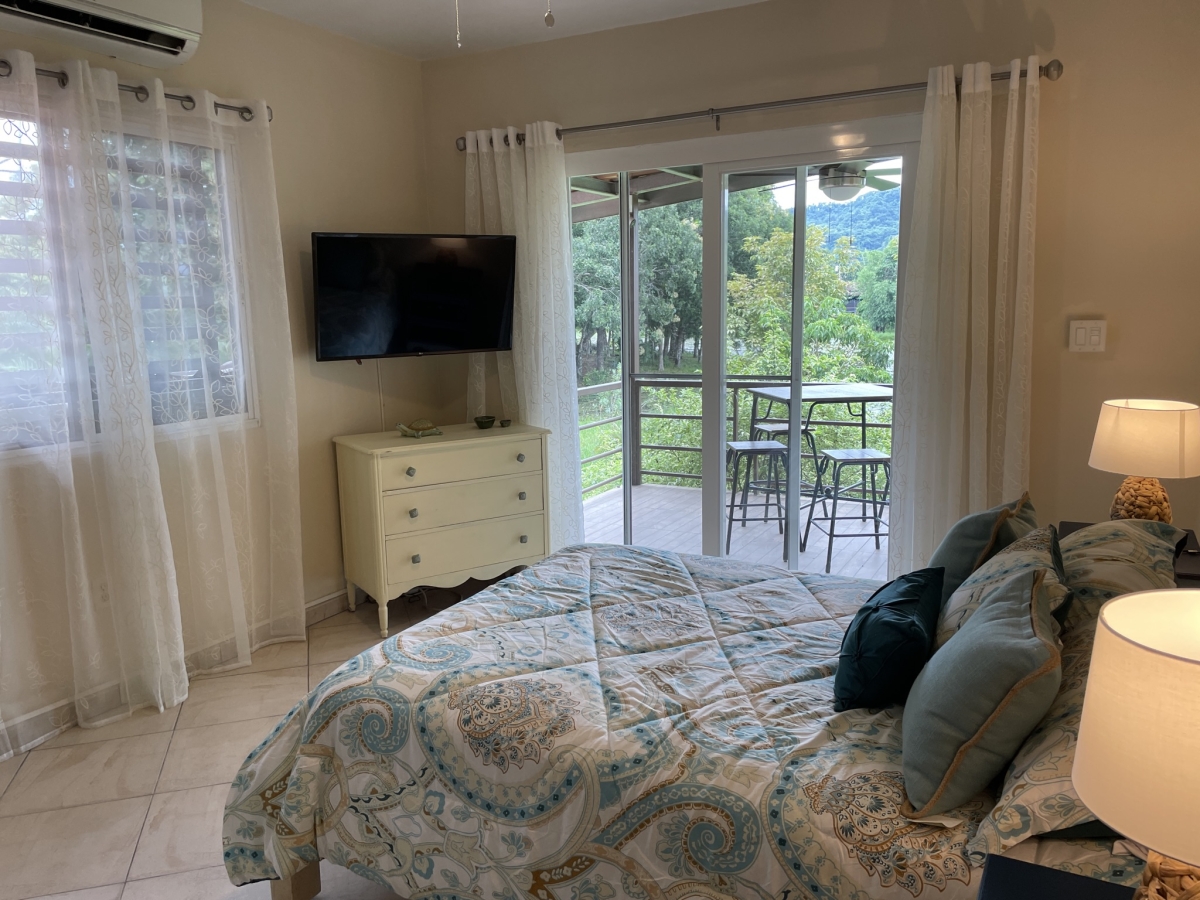 El estudio independiente está adosado a la casa, pero tiene su propia entrada y su terraza, situada ligeramente por debajo de la terraza principal para que las dos partes puedan permanecer separadas. Dispone de cocina americana, dormitorio con cama de matrimonio, cuarto de baño/armario y el patio.