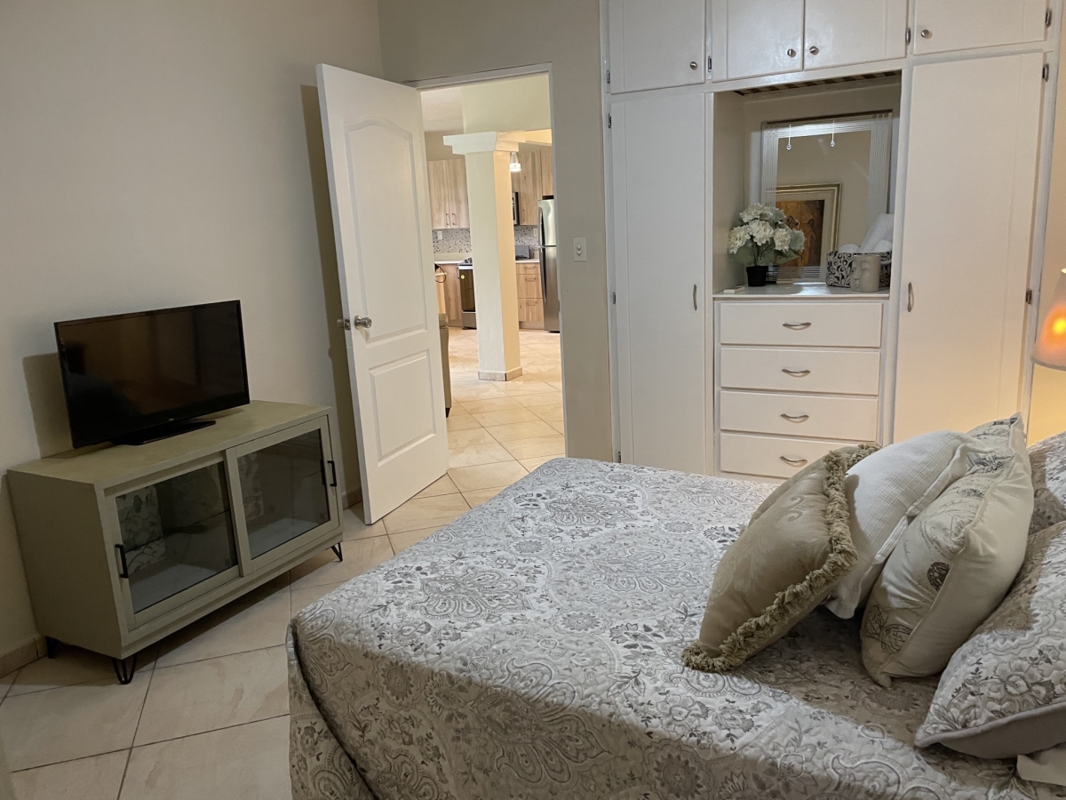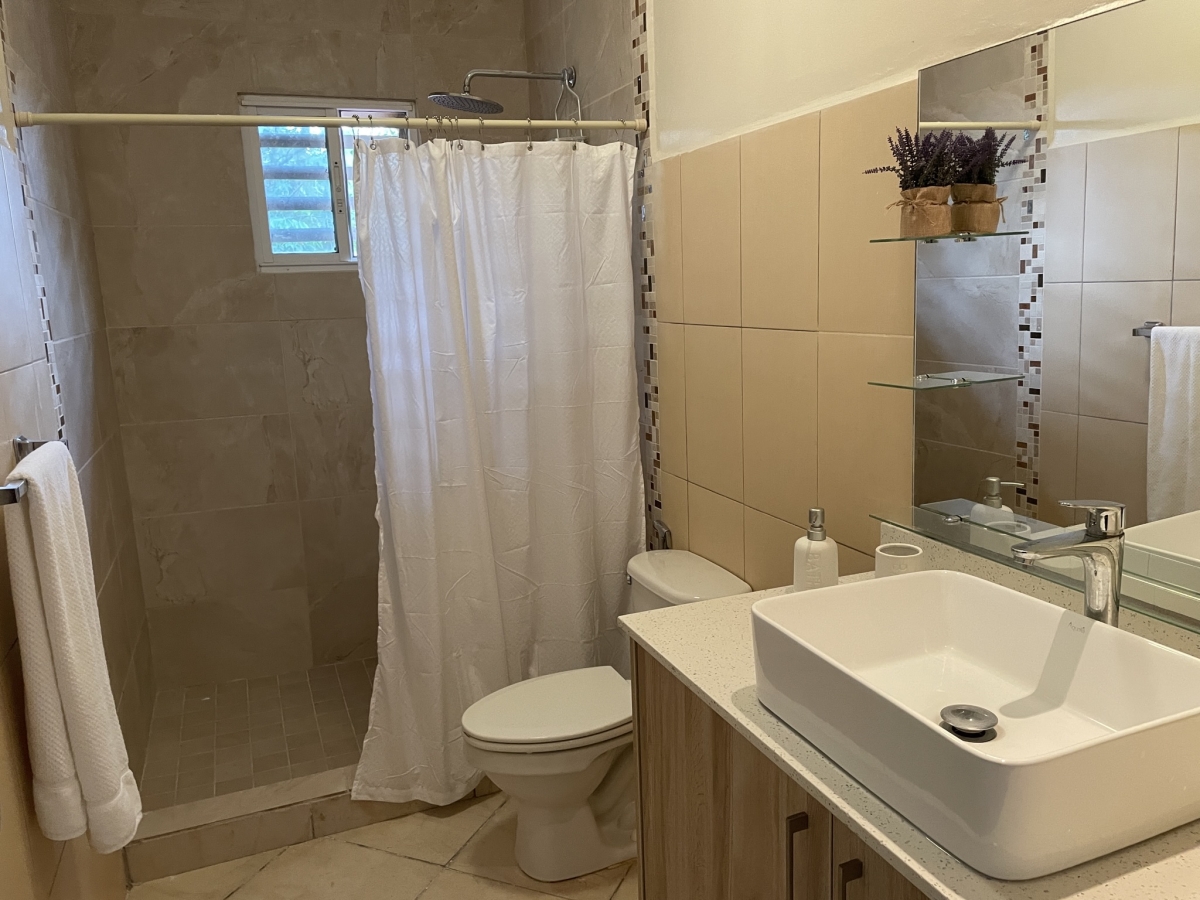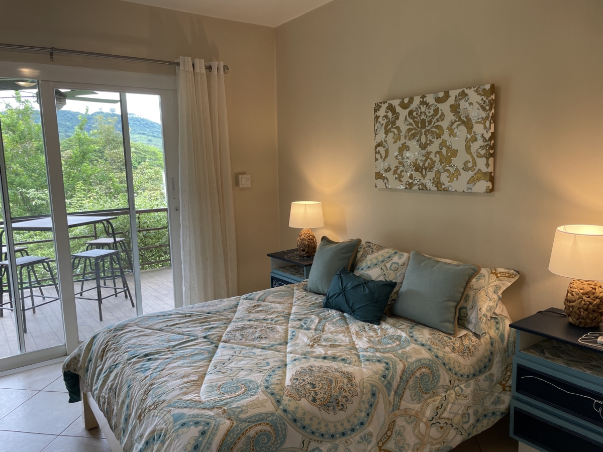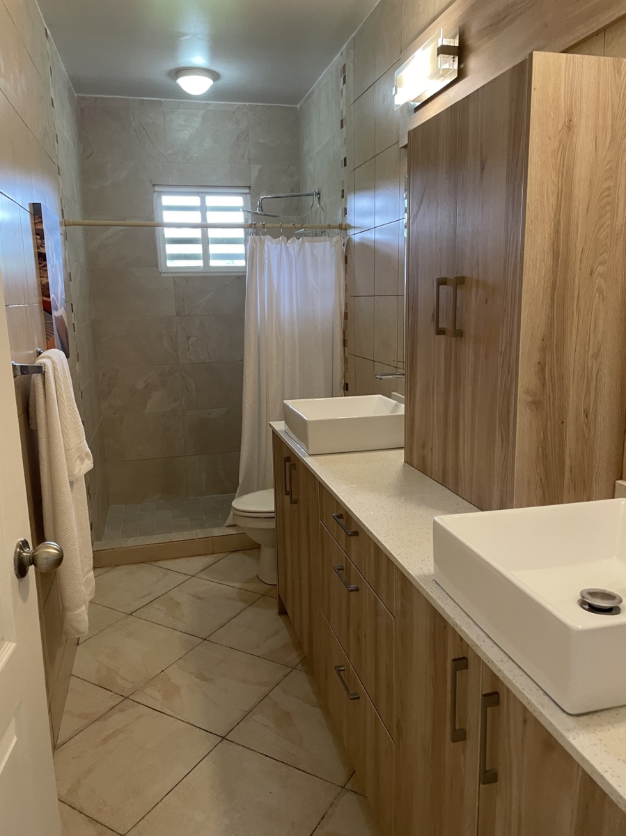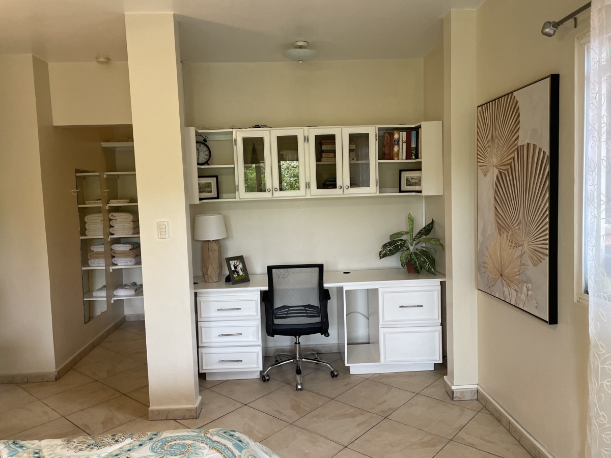 El dormitorio principal incluye un vestidor, un escritorio empotrado y puertas correderas al patio. El baño principal tiene dos lavabos y una gran ducha de azulejos.