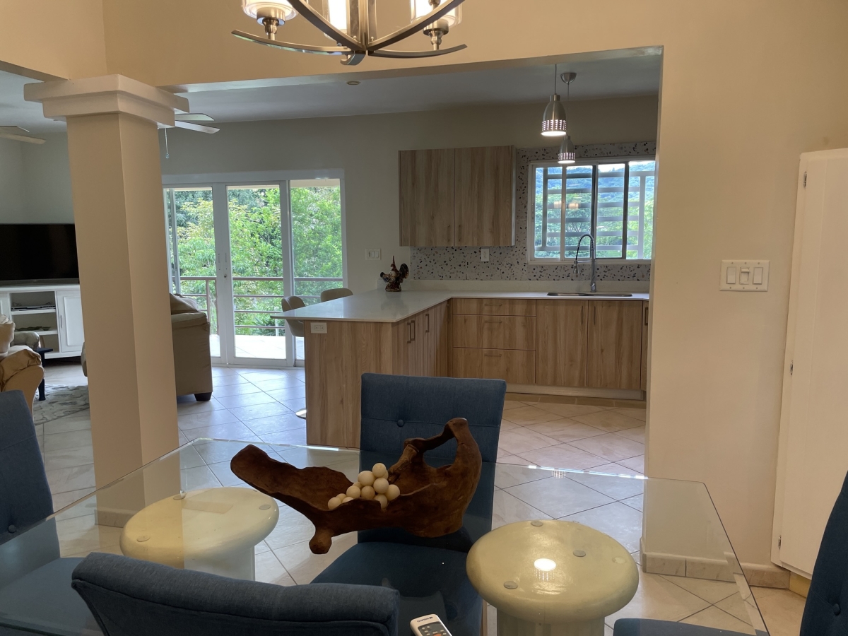 El comedor y la sala de estar miran hacia el patio y el lago, con puertas correderas al patio, que se extiende a lo largo de la casa.