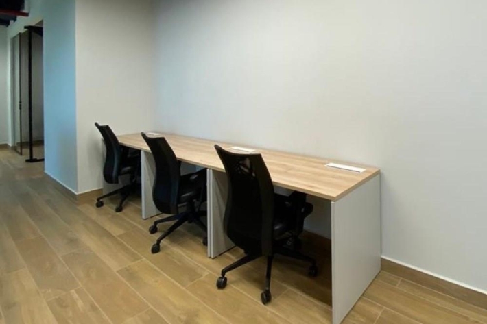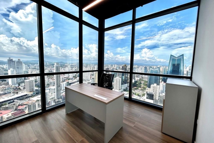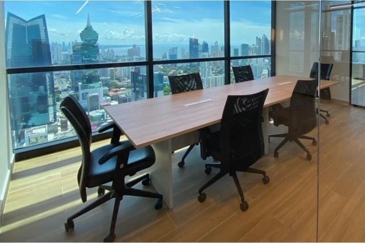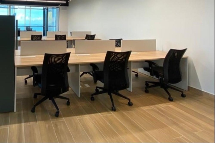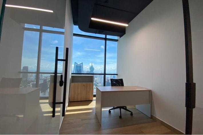 La oficina tiene 95 m2, se entrega con mobiliario, acabados y divisiones. El alquiler incluye la electricidad, el servicio de internet y mantenimiento. La oficina tiene vista panorámica a la ciudad.