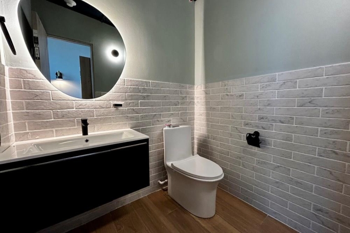 La oficina está distribuida en: 1 sala de reuniones, 5 puestos de trabajo abiertos, 4 oficinas privadas, 1 baño interno, 1 cocina con mini comedor y 1 recepción separada.