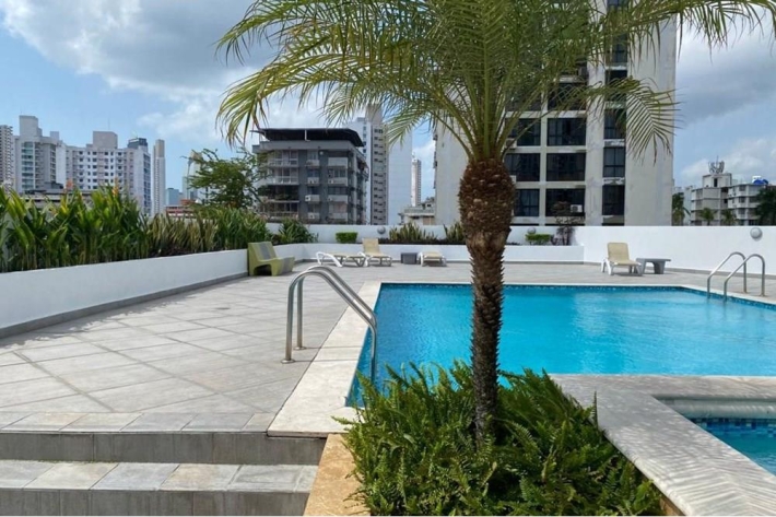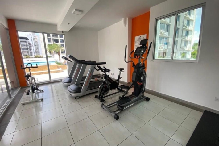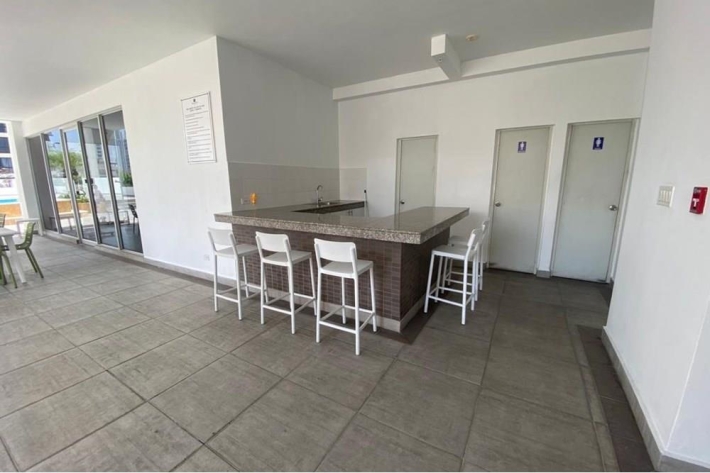 Sala con ventanas de piso a techo, comedor, 2 recámaras, 2 baños, cocina, lavandería, un estacionamiento, área social completa, guardia de seguridad las 24 horas, piso alto.
