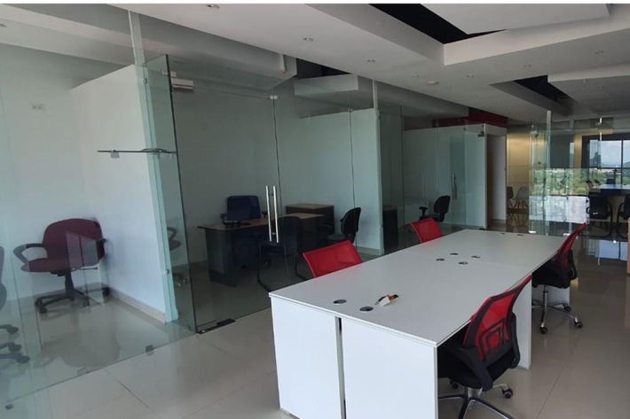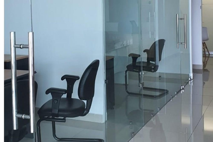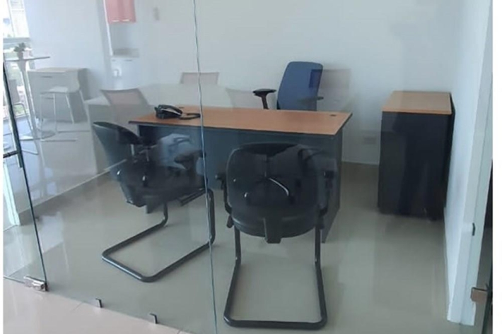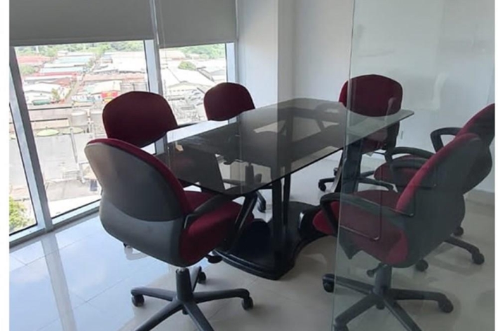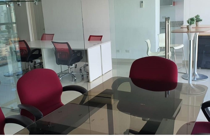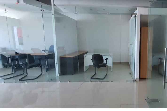 100 m2, recepción, 3 oficinas privadas, sala de reuniones, área compartida para 9 puestos.