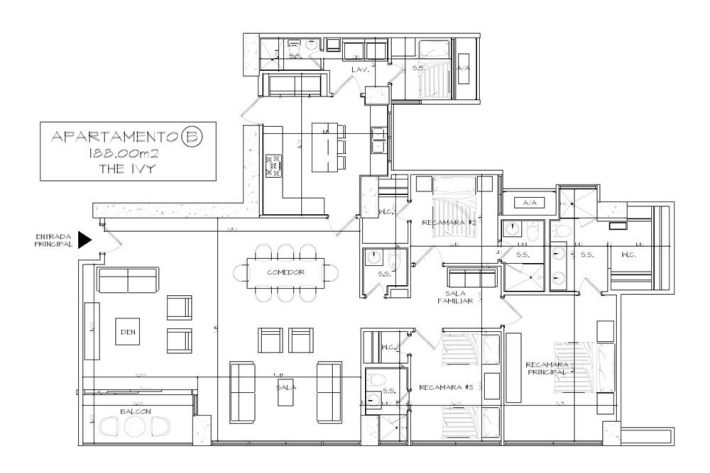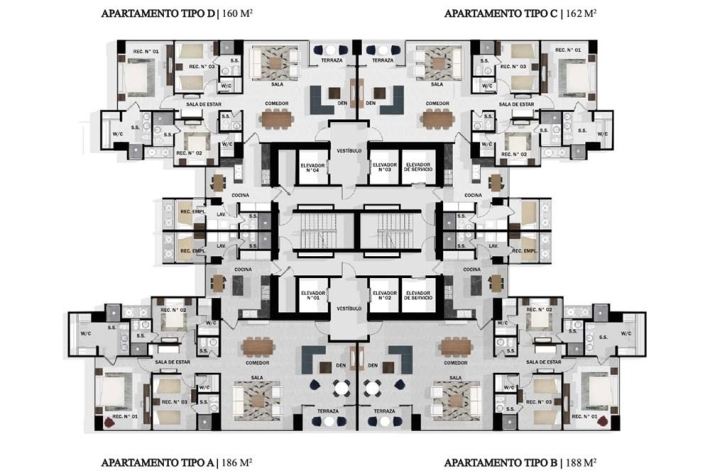 Presentamos el apartamento Modelo C de 160m2, con vista al mar, balcón, comedor, sala, sala familiar, cocina, lavandería, 3 recámaras, 3 baños, 1 cuarto y baño de servicio, 1/2 baño de visita y 2 estacionamientos.
