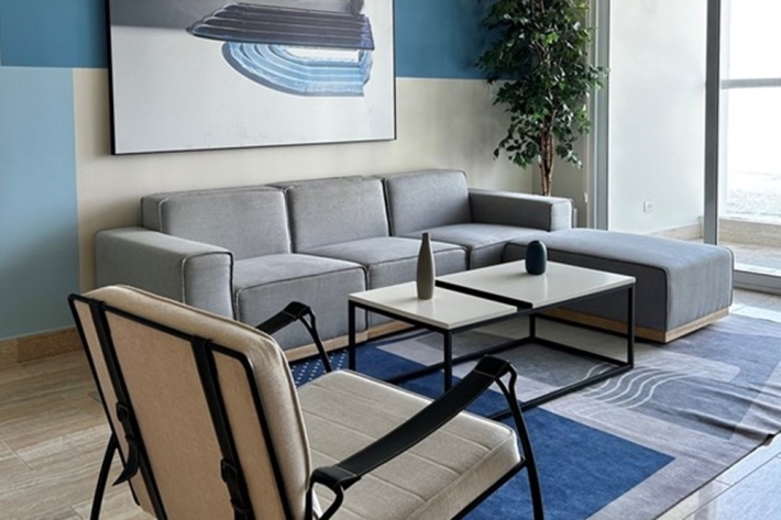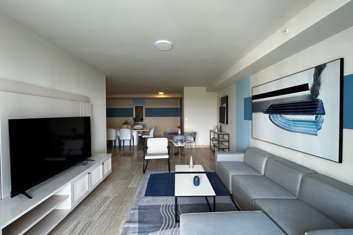 - Sala, comedor y cocina amoblados con diseño contemporáneo.