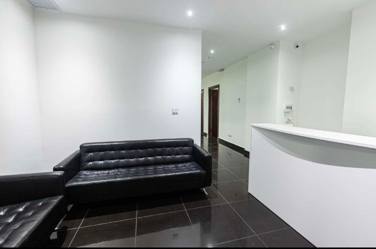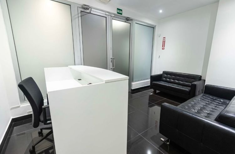 Área de recepción equipada con mesa de recepcionista y muebles para visitantes