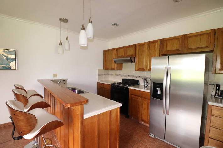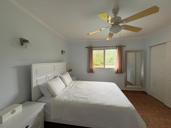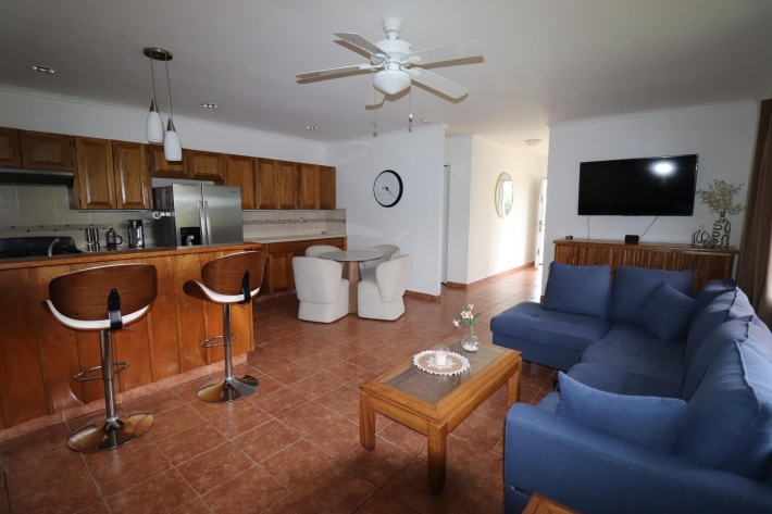 Este condominio amueblado de 2 dormitorios y 2 baños se encuentra a solo 100 metros de Playa Las Lajas, una de las playas más largas y accesibles de la costa del Pacífico de Panamá. Como incentivo adicional, la venta también incluye un Hyundai Tucson 2025, lo que proporciona un valor adicional para el comprador. El condominio ofrece vistas parciales al océano y acceso directo al estilo de vida relajante por el que se conoce a Las Lajas. Características del condominio Tamaño interior: Aproximadamente 1,120 pies cuadrados Dormitorios: 2 Baños: 2 Balcón y terraza: Con vistas a las áreas verdes y proximidad a la playa Unidades de aire acondicionado instaladas Tanque de propano privado Electrodomésticos incluidos: Refrigerador, estufa, lavavajillas, licuadora, lavadora y secadora Sistema de filtración de agua instalado El diseño es práctico y luminoso, con luz natural que entra a través de grandes ventanales. La unidad es parte de un edificio de baja densidad con un total de cuatro condominios, lo que proporciona un ambiente más tranquilo en comparación con complejos más grandes. Áreas Comunes y Exteriores Área Comunitaria para los 4 Condominios: Jardín, alberca, terraza parcialmente techada y mobiliario de exterior Estacionamiento para visitas Áreas Verdes: Ajardinadas con palmeras de coco y plantas tropicales La cuota mensual, a la fecha, es de $100 la cual incluye agua, cambios de filtros y corte de césped.