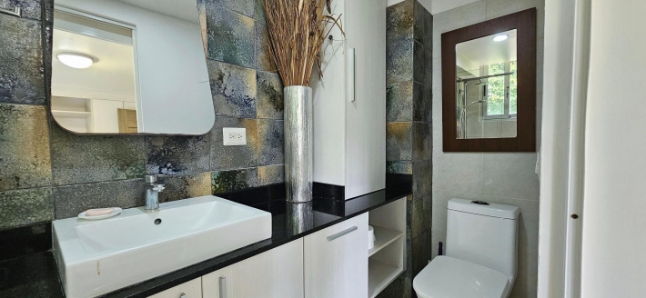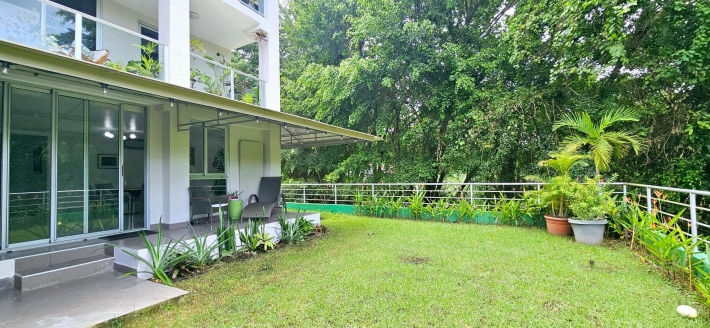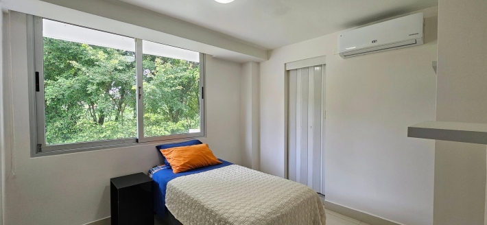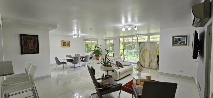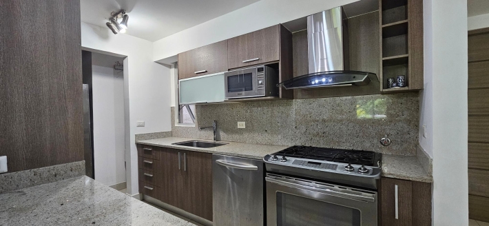 Moderno apartamento en planta baja con luminosa sala - comedor unida a una espectacular terraza rodeada de bosque y vistas a las montañas, ideal para quienes aman el contacto con la naturaleza y pasar tiempo al aire libre. Una cocina abierta a la medida, equipada con línea blanca y acabados de granito, 3 espaciosas recámaras (cada una con baño, principal y una secundaria con walk -in closet), cuarta recámara con baño externo ( o para uso de huéspedes o servicio ) todas con aires splits inverters, área de lavandería, 3 estacionamientos bajo techo y depósito con buen tamaño.