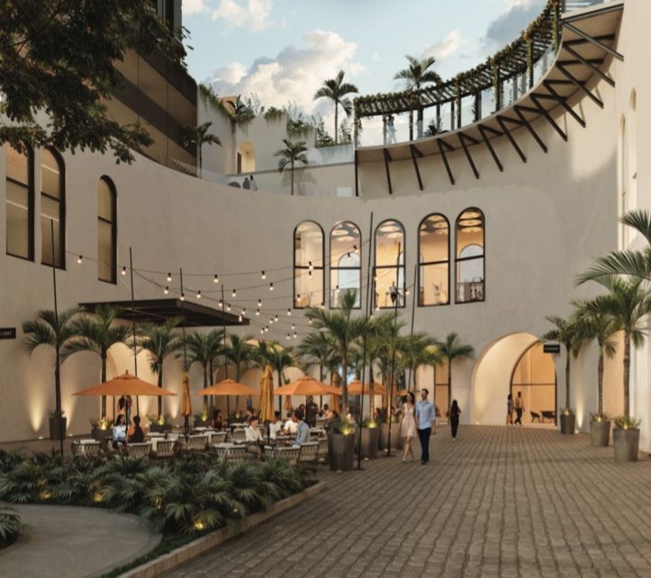 • The Central Plaza: Corazón social del proyecto, rodeado de naturaleza, tiendas y arquitectura única.